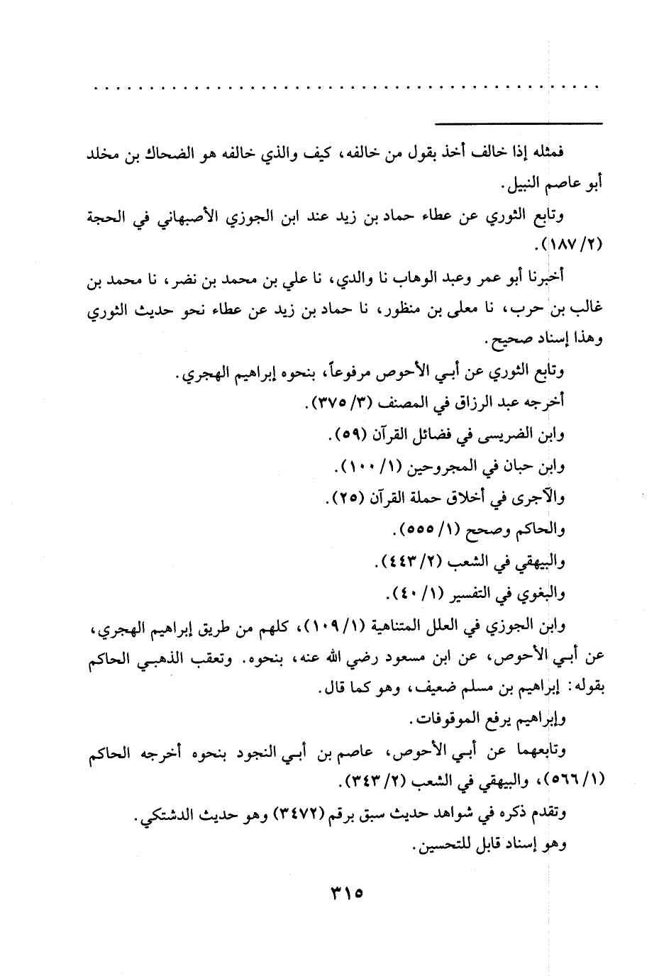 وابن الجوزي في العلل المتناهية (1/ 109)، كلهم من طريق إبراهيم الْهَجَرِيِّ، عَنِ أَبِي الْأَحْوَصِ، عَنِ ابْنِ مَسْعُودٍ رضي الله عنه، بنحوه. وتعقب الذهبي الحاكم بقوله: إبراهيم بن مسلم ضعيف، وهو كما قال.