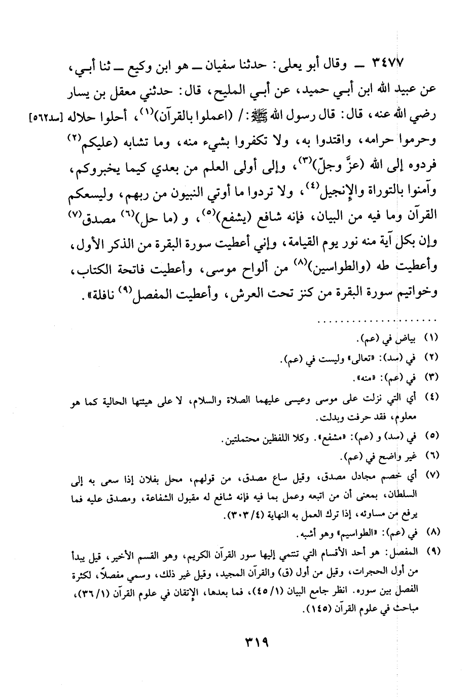 3477 - وَقَالَ أَبُو يَعْلَى: حدثنا سُفْيَانُ - هو ابن وَكِيعٍ - ثنا أَبِي، عَنْ عبيد اللَّهِ ابن أَبِي حُمَيْدٍ، عَنْ أَبِي الْمَلِيحِ، قَالَ: حَدَّثَنِي مَعْقِلُ بْنُ يَسَارٍ رَضِيَ الله عَنْه، قَالَ: قَالَ رَسُولُ اللَّهِ صَلَّى اللَّهُ عَلَيْهِ وَسَلَّمَ: / (§اعْمَلُوا بِالْقُرْآنِ) ، أَحِلُّوا حَلَالَهُ وَحَرِّمُوا حَرَامَهُ، وَاقْتَدَوْا بِهِ، وَلَا تَكْفُرُوا بِشَيْءٍ مِنْهُ، وَمَا تَشَابَهَ (عَلَيْكُمْ فَرَدُّوهُ إِلَى اللَّهِ (عَزَّ وَجَلَّ) ، وَإِلَى أُولِي الْعِلْمِ مِنْ بَعْدِي كَيْمَا يُخْبِرُوكُمْ، وَآمِنُوا بِالتَّوْرَاةِ وَالْإِنْجِيلِ، وَلَا تَرُدُّوا مَا أُوتِيَ النَّبِيُّونَ مِنْ رَبِّهِمْ، وَلْيَسَعُكُمُ الْقُرْآنُ وَمَا فِيهِ مِنَ الْبَيَانِ، فَإِنَّهُ شَافِعٌ (يشفع) ، و (ما حل) مُصَدِّقٌ وَإِنَّ بِكُلِّ آيَةٍ مِنْهُ نور يَوْمَ الْقِيَامَةِ، وَإِنِّي أُعْطِيتُ سُورَةَ الْبَقَرَةِ مِنَ الذِّكْرِ الْأَوَّلِ، وَأُعْطِيتُ طه (وَالطَّوَاسِينَ) مِنْ أَلْوَاحِ مُوسَى، وَأُعْطِيتُ فَاتِحَةَ الْكِتَابِ، وَخَوَاتِيمَ سُورَةِ الْبَقَرَةِ مِنْ كَنْزٍ تَحْتَ الْعَرْشِ، وَأُعْطِيتُ الْمُفَصَّلَ نَافِلَةً ".