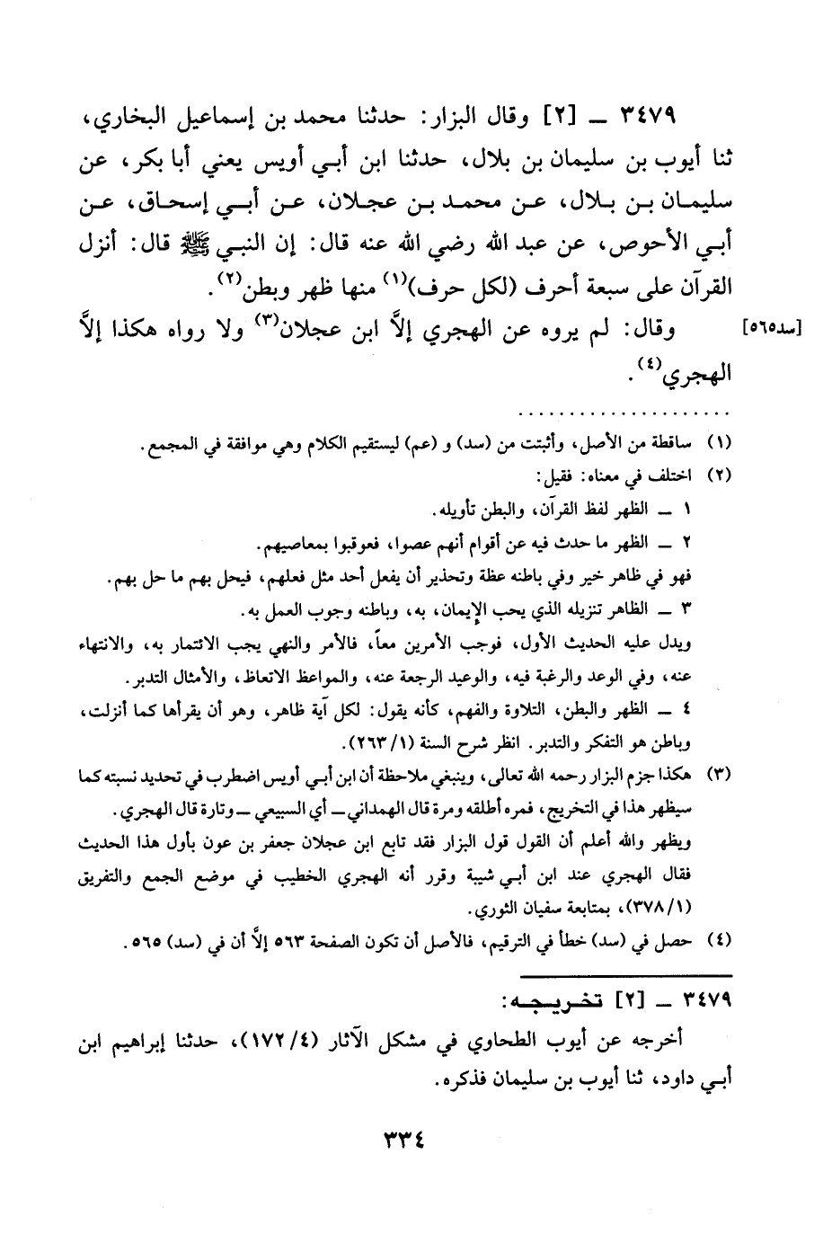 3479 -[2] وَقَالَ الْبَزَّارُ: حدثنا مُحَمَّدُ بْنُ إِسْمَاعِيلَ الْبُخَارِيُّ، ثنا أَيُّوبُ بْنُ سُلَيْمَانَ بْنِ بِلَالِ، حدثنا ابْنُ أَبِي أُوَيْسٍ يَعْنِي أَبَا بَكْرٍ، عَنْ سُلَيْمَانَ بْنِ بِلَالٍ، عَنْ مُحَمَّدِ بْنِ عَجْلَانَ، عَنْ أَبِي إِسْحَاقَ، عَنْ أَبِي الْأَحْوَصِ، عَنْ عَبْدِ اللَّهِ رَضِيَ الله عَنْه قَالَ: إِنَّ النَّبِيَّ صَلَّى اللَّهُ عَلَيْهِ وَسَلَّمَ قَالَ: §أُنْزِلَ الْقُرْآنُ عَلَى سَبْعَةِ أَحْرُفٍ (لِكُلِّ حَرْفٍ) مِنْهَا ظَهْرٌ وَبَطْنٌ.