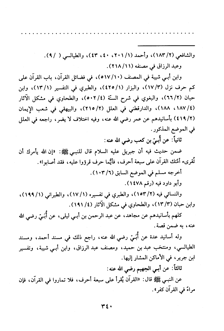 عَنِ النَّبِيِّ -صَلَّى اللَّهُ عَلَيْهِ وَسَلَّمَ- قَالَ:"القرآن يُقرأ على سبعة أحرف، فلا تماروا في القرآن، فإن مراءً في القرآن كفر". =