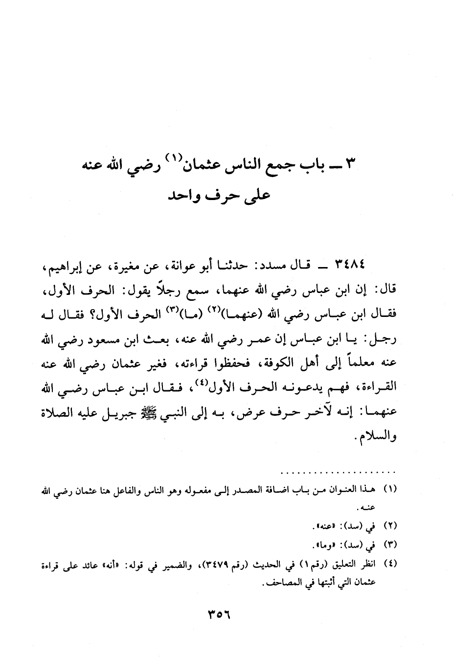 3484 - قَالَ مُسَدَّدٌ: حدثنا أَبُو عَوَانَةَ، عَنْ مُغِيرَةَ، عَنْ إِبْرَاهِيمَ، قَالَ: إِنَّ ابْنَ عَبَّاسٍ رَضِيَ الله عَنْهما، سَمِعَ رَجُلًا يَقُولُ: الْحَرْفُ الْأَوَّلُ، فَقَالَ ابْنُ عَبَّاسٍ رضي الله (عنهما) (مَا) الْحَرْفُ الْأَوَّلُ؟ فَقَالَ لَهُ رَجُلٌ: يَا ابْنَ عَبَّاسٍ إِنَّ عُمَرَ رَضِيَ الله عَنْه، بَعَثَ ابْنَ مَسْعُودٍ رَضِيَ الله عَنْه مُعَلِّمًا إِلَى أَهْلِ الْكُوفَةِ، فَحَفِظُوا قِرَاءَتِهِ، فَغَيَّرَ عُثْمَانُ رَضِيَ الله عَنْه الْقِرَاءَةَ، فَهُمْ يَدْعُونَهُ الْحَرْفَ الْأَوَّلَ، فَقَالَ ابْنُ عَبَّاسٍ رَضِيَ الله عَنْهما: §إِنَّهُ لَآخِرُ حَرْفٍ عَرَضَ، بِهِ إلى النبي صَلَّى اللَّهُ عَلَيْهِ وَسَلَّمَ جبريل عليه الصلاة والسلام.