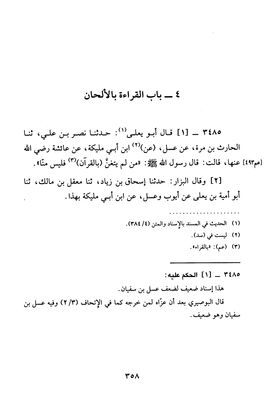 3485 -[1] قَالَ أَبُو يَعْلَى: حدثنا نَصْرُ بْنُ عَلِيٍّ، ثنا الْحَارِثُ بْنُ مُرَّةَ، عَنْ عَسَلٍ، (عَنِ) ابْنِ أَبِي مُلَيْكَةَ، عَنْ عَائِشَةَ رَضِيَ الله عَنْها، قَالَتْ: قَالَ رَسُولُ اللَّهِ صَلَّى اللَّهُ عَلَيْهِ وَسَلَّمَ: " §مَنْ لَمْ يَتَغَنَّ (بِالْقُرْآنِ) فَلَيْسَ مِنَّا ".
