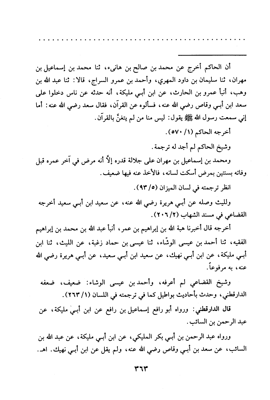 = أن الحاكم أخرج عن محمد بن صالح بن هانئ، ثنا محمد بن إسماعيل بن مهران، ثنا سليمان بن داود المهري، وأحمد بن عمرو السراج، قالا: ثنا عبد الله بن وهب، أنبأ عمرو بن الحارث، عن ابن أبي مليكة، أنه حدثه عن ناس دخلوا على سعد ابن أبي وقاص رضي الله عنه، فسألوه عن القرآن، فقال سعد رضي الله عنه: أَمَا إِنِّي سَمِعْتُ رَسُولَ اللَّهِ -صَلَّى اللَّهُ عليه وسلم- يقول: ليس منا من لم يتغنَّ بالقرآن.