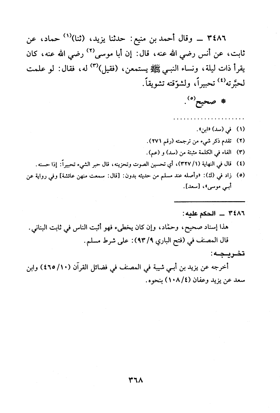 3486 - وَقَالَ أَحْمَدُ بْنُ مَنِيعٍ: حدثنا يَزِيدُ، (ثنا) حَمَّادٌ، عَنْ ثَابِتٍ، عَنْ أَنَسٍ رَضِيَ الله عَنْه، قَالَ: إِنَّ §أَبَا مُوسَى رَضِيَ الله عَنْه، كَانَ يَقْرَأُ ذَاتَ لَيْلَةٍ، وَنِسَاءُ النَّبِيِّ صَلَّى اللَّهُ عَلَيْهِ وَسَلَّمَ يَسْتَمِعْنَ، (فَقِيلَ) لَهُ، فَقَالَ: لَوْ عَلِمْتُ لَحَبَّرْتُهُ تَحْبِيرًا، ولشوقته تَشْوِيقًا.