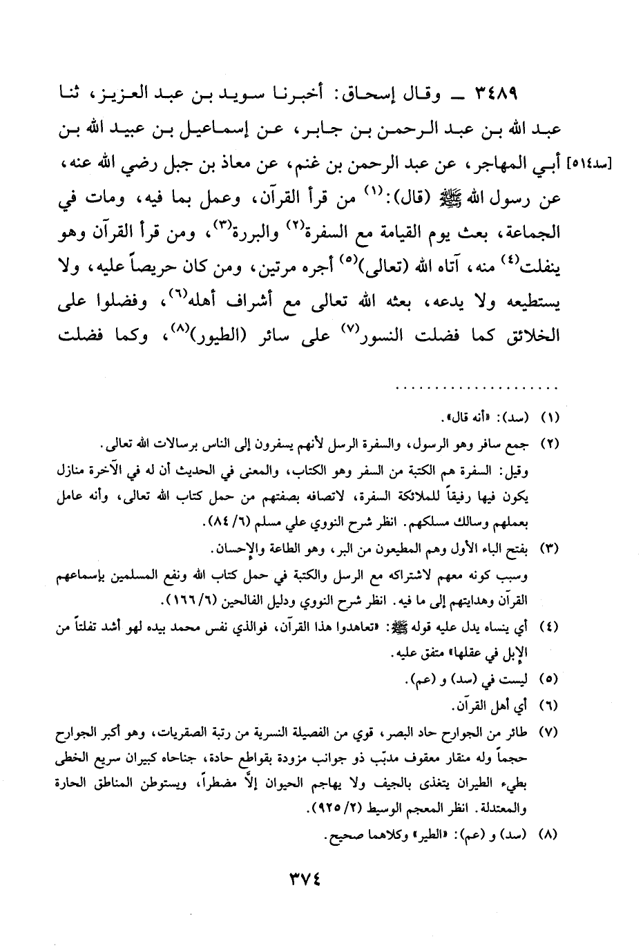 3489 - وقال إِسْحَاقُ: أخبرنا سُوَيْدُ بْنُ عَبْدِ الْعَزِيزِ، ثنا عَبْدُ اللَّهِ بْنُ عَبْدِ الرَّحْمَنِ بْنِ جَابِرٍ، عَنْ إِسْمَاعِيلَ بْنِ عُبَيْدِ اللَّهِ بْنِ أَبِي الْمُهَاجِرِ، عَنْ عَبْدِ الرَّحْمَنِ بْنِ غَنْمٍ، عَنْ مُعَاذِ بْنِ جَبَلٍ رَضِيَ الله عَنْه، عَنْ رَسُولِ اللَّهِ صَلَّى اللَّهُ عَلَيْهِ وَسَلَّمَ (قَالَ) : §مَنْ قَرَأَ الْقُرْآنَ، وَعَمِلَ بِمَا فِيهِ، وَمَاتَ فِي الْجَمَاعَةِ، بُعِثَ يَوْمَ الْقِيَامَةِ مَعَ السَّفَرَةِ وَالْبَرَرَةِ، وَمَنْ قَرَأَ الْقُرْآنَ وَهُوَ ينفلت مِنْهُ، آتَاهُ اللَّهُ (تعالى) أَجْرَهُ مَرَّتَيْنِ، وَمَنْ كان حَرِيصًا عَلَيْهِ، وَلَا يَسْتَطِيعُهُ وَلَا يَدَعُهُ، بَعَثَهُ اللَّهُ تعالى مَعَ أشراف أَهْلِهِ، وَفُضِّلُوا عَلَى الْخَلَائِقِ كَمَا فُضِّلَتِ النُّسُورُ عَلَى سَائِرِ (الطيور) ، وَكَمَا فُضِّلَتْ