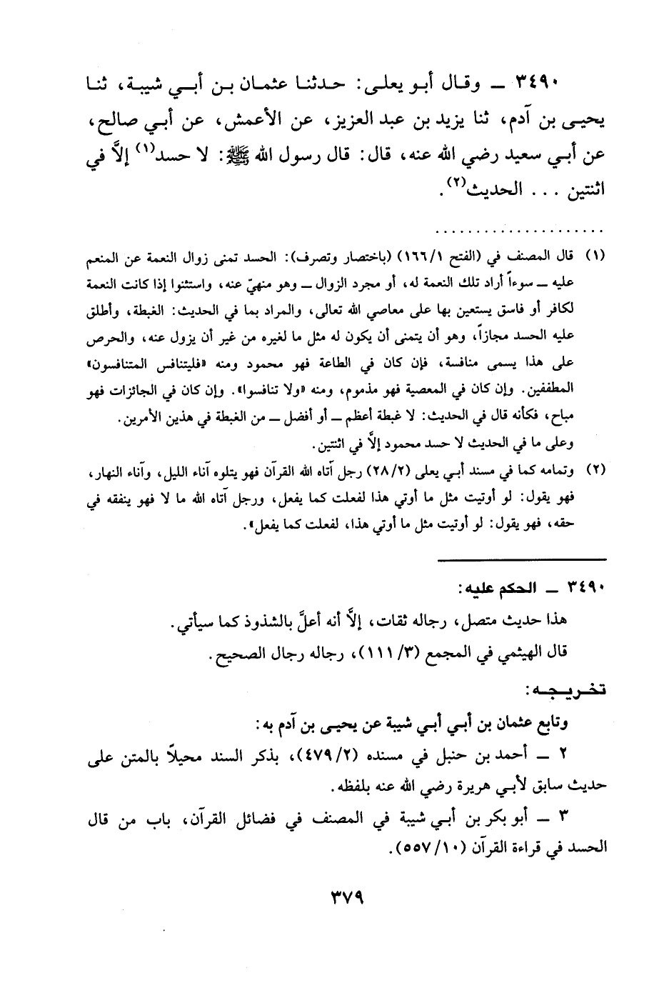 3490 - وَقَالَ أَبُو يَعْلَى: حدثنا عُثْمَانُ بن أَبِي شَيْبَةَ، ثنا يَحْيَى بْنُ آدَمَ، ثنا يَزِيدُ بْنُ عَبْدِ الْعَزِيزِ، عَنِ الْأَعْمَشِ، عَنْ أَبِي صَالِحٍ، عَنْ أَبِي سَعِيدٍ رَضِيَ الله عَنْه، قَالَ: قَالَ رَسُولُ اللَّهِ صَلَّى اللَّهُ عَلَيْهِ وَسَلَّمَ: §لَا حَسَدَ إِلَّا فِي اثْنَتَيْنِ ... الْحَدِيثَ.