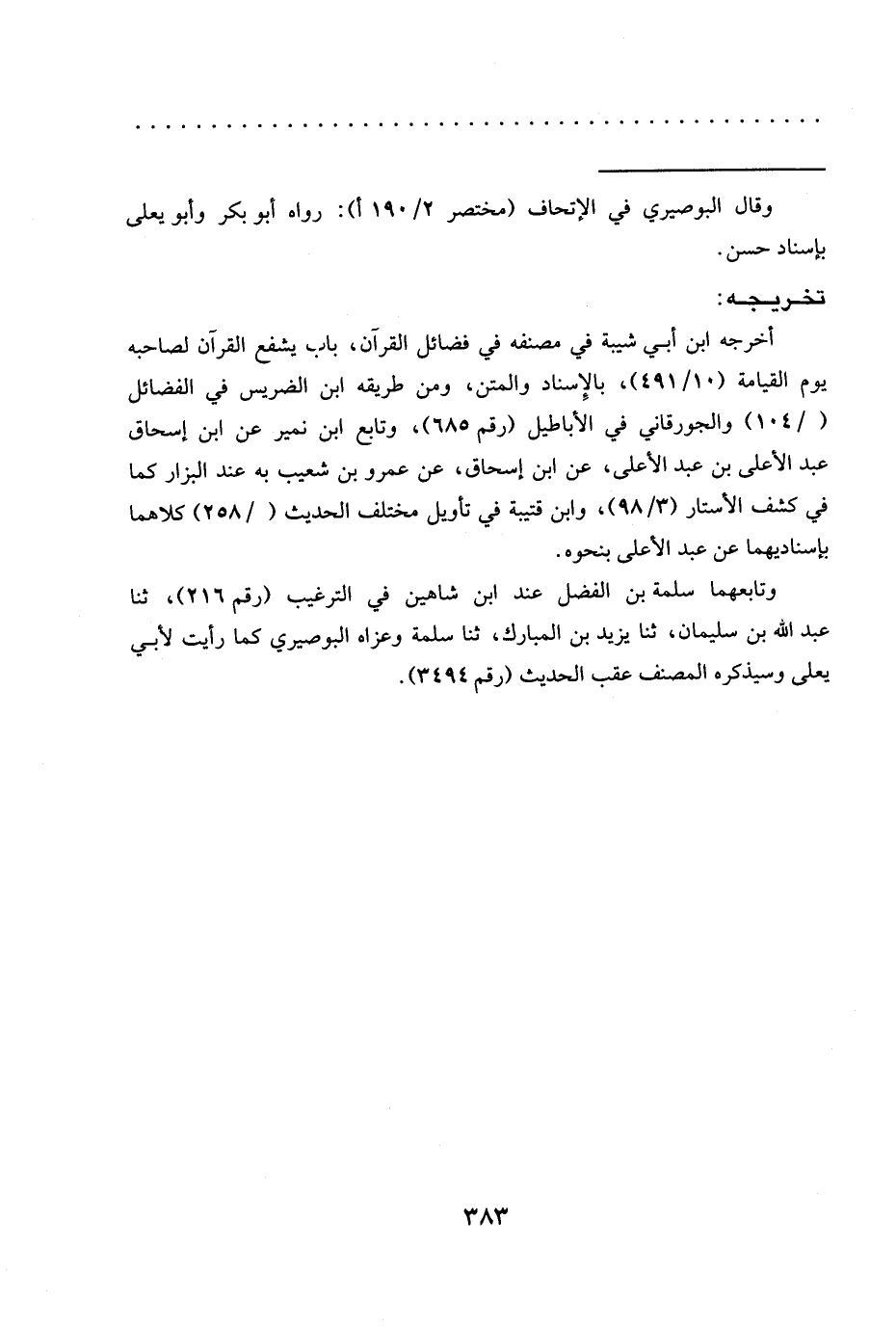 أخرجه ابن أبي شيبة في مصنفه في فضائل القرآن، باب يشفع القرآن لصاحبه يوم القيامة (10/ 491)، بالإِسناد والمتن، ومن طريقه ابن الضريس في الفضائل (/104) والجورقاني في الأباطيل (رقم 685)، وتابع ابن نمير عن ابن إسحاق عبد الأعلي بن عبد الأعلى، عن ابن إسحاق، عن عمرو بن شعيب به عند البزّار كما في كشف الأستار (3/ 98)، وابن قتيبة في تأويل مختلف الحديث (/258) كلاهما بإسناديهما عن عبد الأعلى بنحوه.