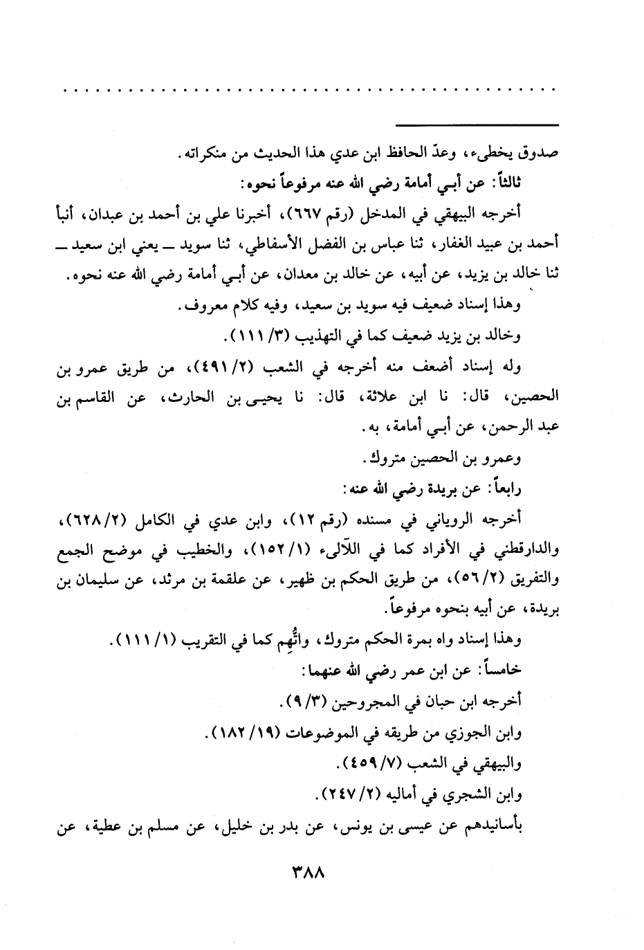 أخرجه الروياني في مسنده (رقم 12)، وابن عدي في الكامل (2/ 628)، والدارقطني في الأفراد كما في اللآلىء (1/ 152)، والخطيب في موضح الجمع والتفريق (2/ 56)، من طريق الحكم بن ظهير، عن علقمة بن مرثد، عن سليمان بن بريدة، عن أبيه بنحوه مرفوعًا.