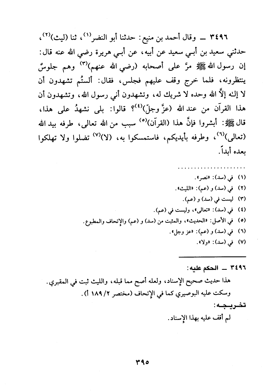 3496 - وَقَالَ أَحْمَدُ بْنُ مَنِيعٍ: حدثنا أَبُو النضر، ثنا (ليث) ، حَدَّثَنِي سَعِيدُ بْنُ أَبِي سَعِيدٍ عَنْ أَبِيهِ، عَنْ أَبِي هُرَيْرَةَ رَضِيَ الله عَنْه قَالَ: إِنَّ رَسُولَ اللَّهِ صَلَّى اللَّهُ عَلَيْهِ وَسَلَّمَ مَرَّ عَلَى أَصَحَابِهِ (رَضِيَ الله عَنْهم) وَهُمْ جُلُوسٌ يَنْتَظِرُونَهُ، فَلَمَّا خَرَجَ وَقَفَ عَلَيْهِمْ فَجَلَسَ، فَقَالَ: §ألستم تَشْهَدُونَ أَنْ لَا إِلَهَ إِلَّا اللَّهُ وَحْدَهُ لَا شَرِيكَ لَهُ، وَتَشْهَدُونَ أَنِّي رَسُولُ اللَّهِ، وَتَشْهَدُونَ أَنَّ هَذَا الْقُرْآنَ مِنْ عِنْدِ اللَّهِ (عز وجل) ؟ قَالُوا: بَلَى نَشْهَدُ عَلَى هَذَا، قَالَ صَلَّى اللَّهُ عَلَيْهِ وَسَلَّمَ: أَبْشِرُوا فَإِنَّ هَذَا (القرآن) سَبَبٌ مِنَ اللَّهِ تعالى، طرفه بِيَدِ الله (تعالى) ، وطرفه بأيديكم، فاستمسكوا به، (لا) تَضِلُّوا وَلَا تَهْلِكُوا بَعْدَهُ أَبَدًا.