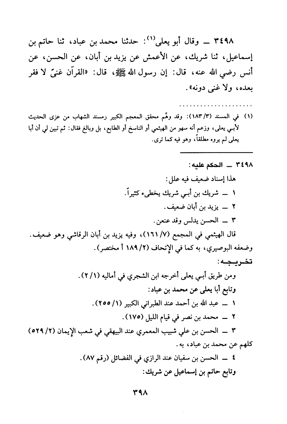 3498 - وَقَالَ أَبُو يَعْلَى: حدثنا مُحَمَّدُ بْنُ عَبَّادٍ، ثنا حَاتِمُ بْنُ إِسْمَاعِيلَ، ثنا شَرِيكٌ، عَنِ الْأَعْمَشِ عَنْ يَزِيدَ بْنِ أَبَانَ، عَنِ الْحَسَنِ، عَنْ أَنَسٍ رَضِيَ الله عَنْه، قَالَ: إِنَّ رَسُولَ اللَّهِ صَلَّى اللَّهُ عَلَيْهِ وَسَلَّمَ، قَالَ: " §الْقُرْآنُ غِنًى لَا فَقْرَ بَعْدَهُ، وَلَا غِنًى دُونَهُ ".