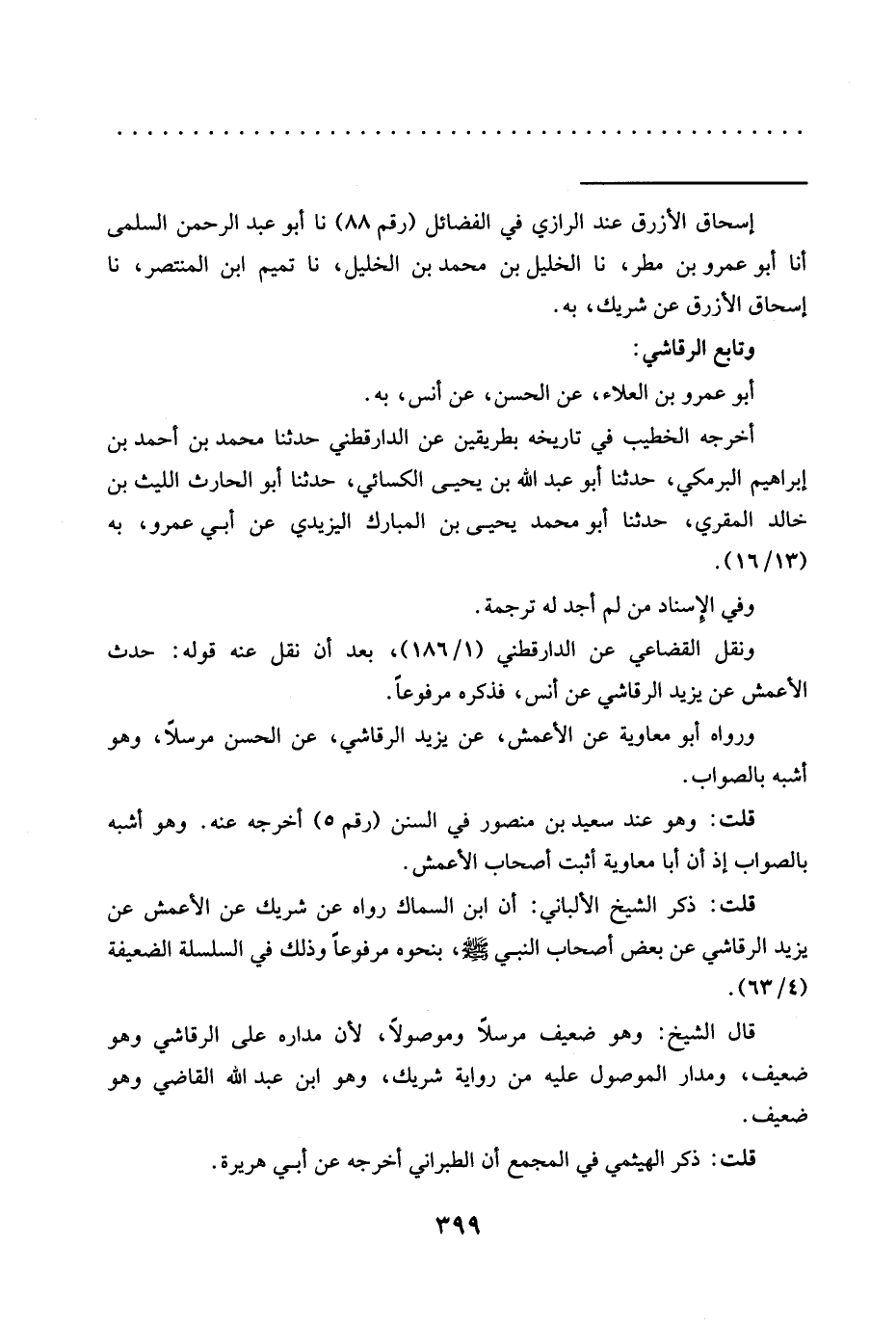 ونقل القضاعي عن الدارقطني (1/ 186)، بعد أن نقل عنه قوله: حدث الأعمش عن يزيد الرقاشي عن أنس، فذكره مرفوعًا.