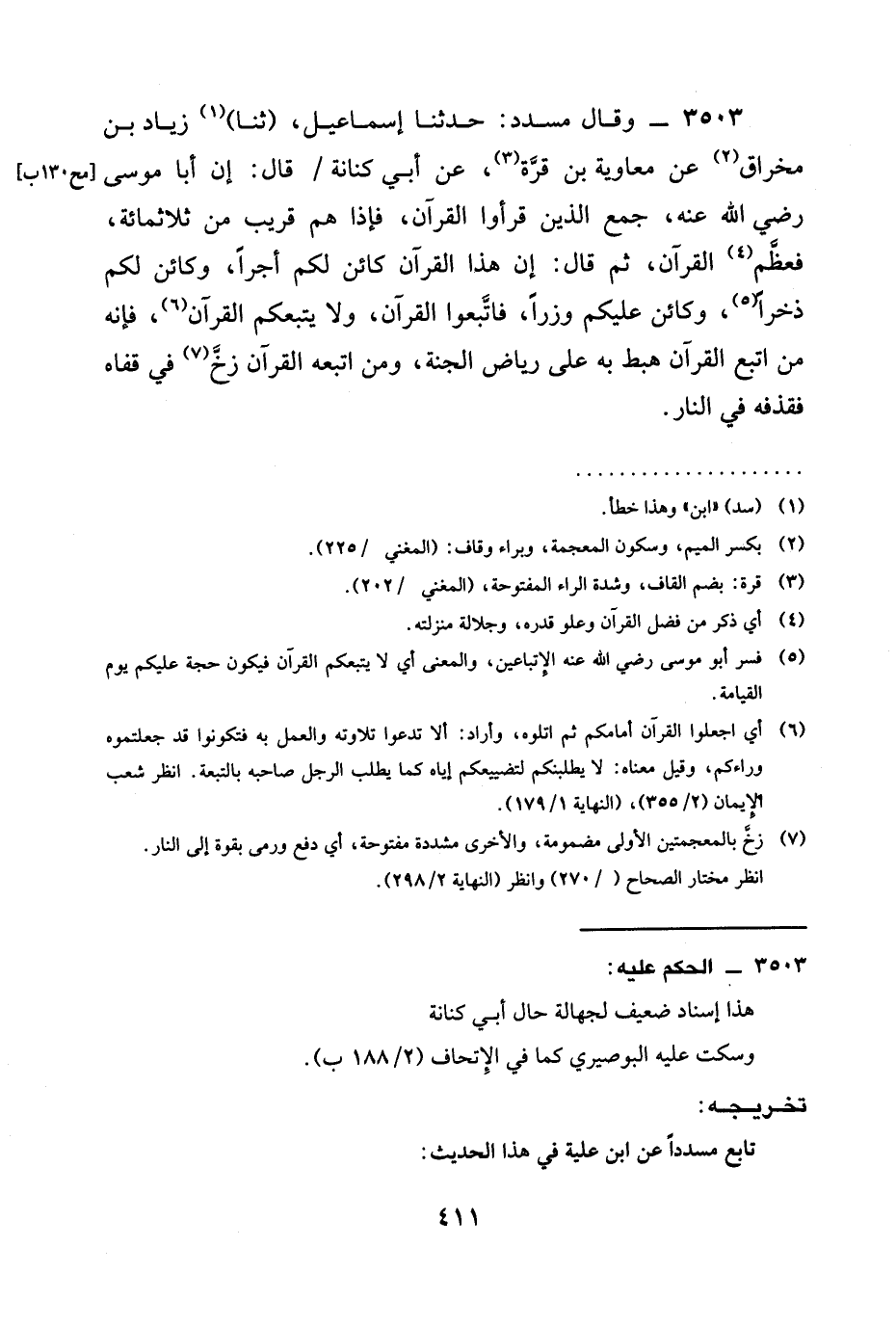 3503 - وقال مُسَدَّدٌ: حدثنا إِسْمَاعِيلُ، (ثنا) زِيَادُ بْنُ مِخْرَاقٍ عَنْ مُعَاوِيَةَ بْنِ قُرَّةَ، عَنْ أَبِي كِنَانَةَ / قَالَ: إِنَّ أَبَا مُوسَى رَضِيَ الله عَنْه، جَمَعَ الَّذِينَ قرأوا الْقُرْآنَ، فَإِذَا هُمْ قَرِيبٌ مِنْ ثَلَاثِمِائَةٍ، فَعَظَّمَ الْقُرْآنَ، ثُمَّ قَالَ: §إِنَّ هَذَا الْقُرْآنَ كَائِنٌ لَكُمْ أَجْرًا، وَكَائِنٌ لَكُمْ ذخرا، وَكَائِنٌ عَلَيْكُمْ وِزْرًا، فَاتَّبِعُوا الْقُرْآنَ، وَلَا يَتَّبِعْكُمُ الْقُرْآنُ، فَإِنَّهُ مَنِ اتَّبَعَ الْقُرْآنَ هَبَطَ بِهِ عَلَى رِيَاضِ الْجَنَّةِ، وَمَنِ اتَّبَعَهُ الْقُرْآنُ زخ في قفاه فقذفه فِي النَّارِ.