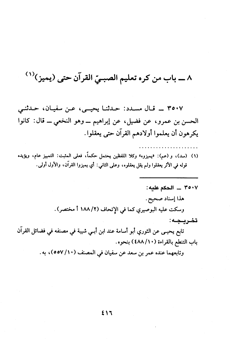 3507 - قَالَ مُسَدَّدٌ: حدثنا يَحْيَى، عَنْ سُفْيَانَ، حَدَّثَنِي الْحَسَنُ بْنُ عَمْرٍو، عَنْ فُضَيْلٍ، عَنْ إِبْرَاهِيمَ - وهو النَّخَعِيُّ - قَالَ: كَانُوا §يَكْرَهُونَ أَنْ يُعَلِّمُوا أَوْلَادَهُمُ الْقُرْآنَ حَتَّى يَعْقِلُوا.