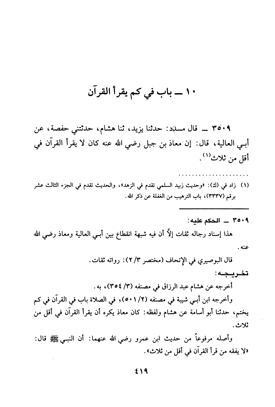 3509 - قَالَ مُسَدَّدٌ: حدثنا يَزِيدُ، ثنا هِشَامٌ، حَدَّثَتْنِي حَفْصَةُ، عَنْ أَبِي الْعَالِيَةِ، قَالَ: إِنَّ مُعَاذَ بْنَ جَبَلٍ رَضِيَ الله عَنْه كَانَ §لَا يَقْرَأُ الْقُرْآنَ فِي أَقَلَّ مِنْ ثَلَاثٍ.