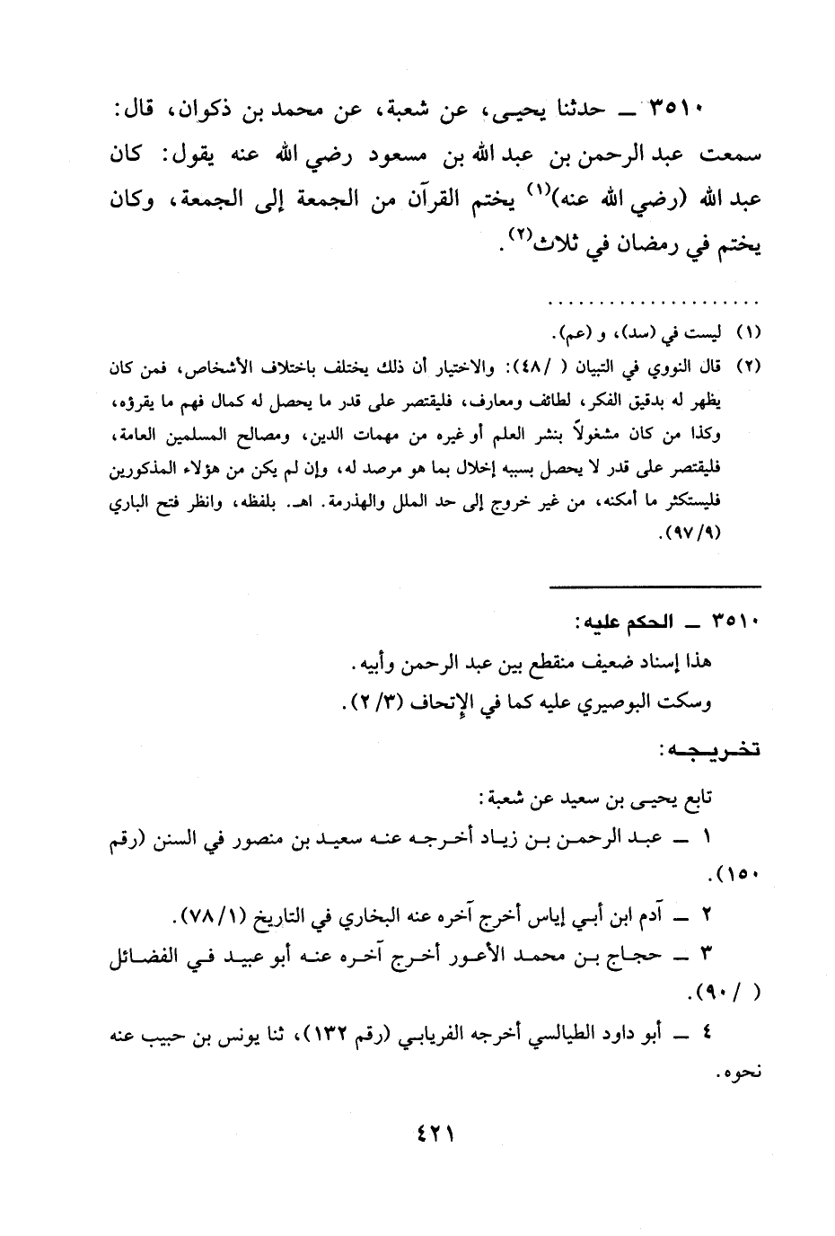 3510 - حدثنا يَحْيَى، عَنْ شُعْبَةَ، عَنْ مُحَمَّدِ بْنِ ذَكْوَانَ، قَالَ: سَمِعْتُ عَبْدَ الرَّحْمَنِ بْنَ عَبْدِ اللَّهِ بْنِ مَسْعُودٍ رَضِيَ الله عَنْه يَقُولُ: كَانَ عَبْدُ اللَّهِ (رَضِيَ الله عَنْه) §يَخْتِمُ الْقُرْآنَ مِنَ الْجُمُعَةِ إِلَى الْجُمُعَةِ، وَكَانَ يَخْتِمُ فِي رَمَضَانَ فِي ثَلَاثٍ.