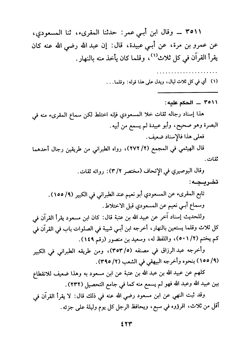 3511 - وَقَالَ ابن أَبِي عُمَرَ: حدثنا الْمُقْرِئُ، ثنا الْمَسْعُودِيُّ، عَنْ عَمْرِو بْنِ مُرَّةَ، عَنْ أَبِي عُبَيْدَةَ، قَالَ: إِنَّ عَبْدَ اللَّهِ رَضِيَ الله عَنْه كَانَ §يَقْرَأُ الْقُرْآنَ فِي كُلِّ ثَلَاثٍ، وَقَلَّمَا كَانَ يَأْخُذُ مِنْهُ بِالنَّهَارِ.