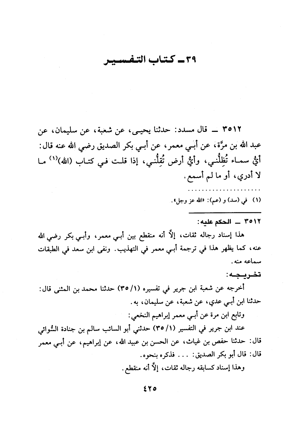3512 - قَالَ مُسَدَّدٌ: حدثنا يَحْيَى، عَنْ شُعْبَةَ، عَنْ سُلَيْمَانَ، عَنْ عَبْدِ اللَّهِ بْنِ مُرَّةَ، عَنْ أَبِي مَعْمَرٍ، عَنْ أَبِي بَكْرٍ الصِّدِّيقِ رَضِيَ الله عَنْه قَالَ: §أَيُّ سَمَاءِ تُظِلُّنِي، وَأَيُّ أَرْضٍ تُقِلُّنِي، إِذَا قُلْتُ فِي كِتَابِ (اللَّهِ) مَا لَا أَدْرِي، أَوْ مَا لَمْ أَسْمَعْ.