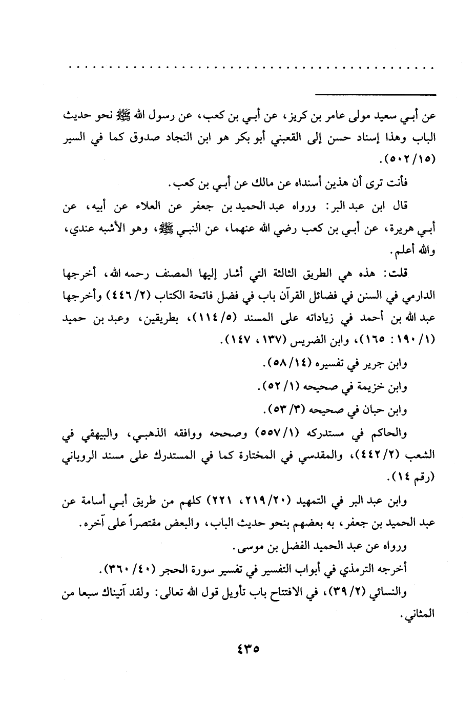 قلت: هذه هي الطريق الثالثة التي أشار إليها المصنف رحمه الله، أخرجها الدارمي في السنن في فضائل القرآن باب في فضل فاتحة الكتاب (2/ 446) وأخرجها عبد الله بن أحمد في زياداته على المسند (5/ 114)، بطريقين، وعبد بن حميد (1/ 190: 165)، وابن الضريس (137، 147).