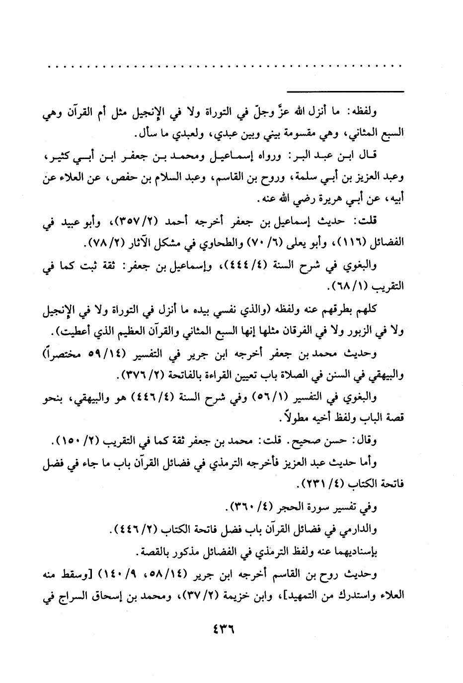 وحديث محمد بن جعفر أخرجه ابن جرير في التفسير (59/ 14 مختصرًا) والبيهقي في السنن في الصلاة باب تعيين القراءة بالفاتحة (2/ 376).