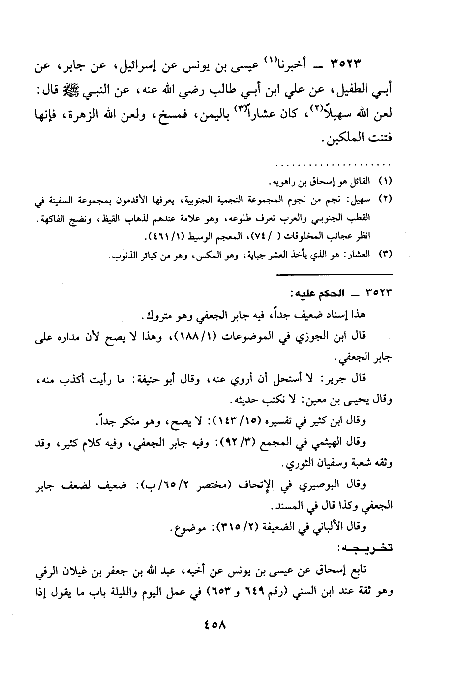 3523 - أخبرنا عِيسَى بْنُ يُونُسَ عَنْ إِسْرَائِيلَ، عَنْ جَابِرٍ، عَنْ أَبِي الطُّفَيْلِ، عَنْ عَلِيِّ ابن أَبِي طَالِبٍ رَضِيَ الله عَنْه، عَنِ النَّبِيِّ صَلَّى اللَّهُ عَلَيْهِ وَسَلَّمَ قَالَ: §لَعَنَ اللَّهُ سُهَيْلًا، كَانَ عَشَّارًا بِالْيَمَنِ، فَمُسِخَ، وَلَعَنَ اللَّهُ الزَّهْرَةَ، فَإِنَّهَا فَتَنَتِ الْمَلَكَيْنِ.