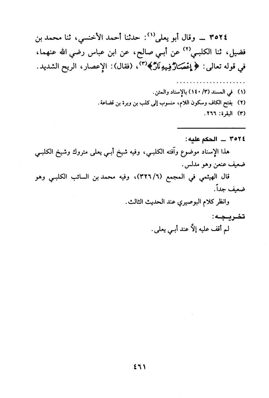 3524 - وَقَالَ أَبُو يَعْلَى: حدثنا أَحْمَدُ الْأَخْنَسِيُّ، ثنا مُحَمَّدُ بْنُ فُضَيْلٍ، ثنا الْكَلْبِيُّ عَنْ أَبِي صَالِحٍ، عَنِ ابْنِ عَبَّاسٍ رَضِيَ الله عَنْهما، فِي قَوْلِهِ تَعَالَى: {§إِعْصَارٌ فِيهِ نَارٌ} ، (فقال) : الْإِعْصَارُ، الرِّيحُ الشديد.