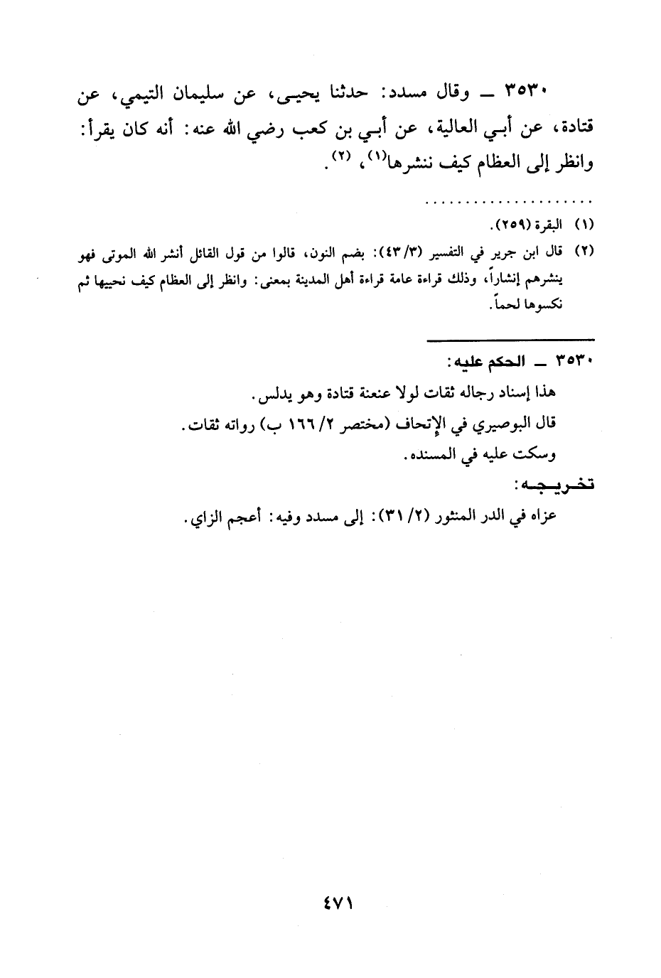 3530 - وَقَالَ مُسَدَّدٌ: حدثنا يَحْيَى، عَنْ سُلَيْمَانَ التَّيْمِيِّ، عَنْ قَتَادَةَ، عَنْ أَبِي الْعَالِيَةِ، عَنْ أُبَيِّ بْنِ كَعْبٍ رَضِيَ الله عَنْه: أَنَّهُ كَانَ §يَقْرَأُ: وَانْظُرْ إِلَى الْعِظَامِ كَيْفَ نُنْشِرُهَا.