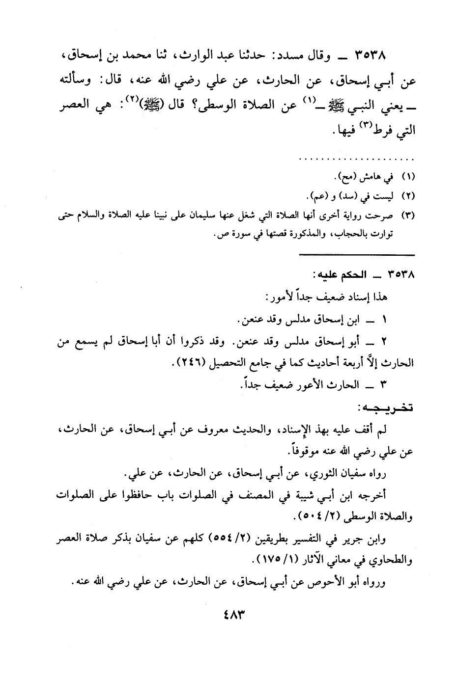3538 - وَقَالَ مُسَدَّدٌ: حدثنا عَبْدُ الْوَارِثِ، ثنا مُحَمَّدُ بْنُ إِسْحَاقَ، عَنْ أَبِي إِسْحَاقَ، عَنِ الْحَارِثِ، عَنْ عَلِيٍّ رَضِيَ الله عَنْه، قَالَ: وَسَأَلْتُهُ - يَعْنِي النَّبِيَّ صَلَّى اللَّهُ عَلَيْهِ وَسَلَّمَ - عَنِ §الصَّلَاةِ الْوُسْطَى؟ قَالَ (صَلَّى اللَّهُ عَلَيْهِ وَسَلَّمَ) : هِيَ الْعَصْرُ الَّتِي فُرِّطَ فِيهَا.