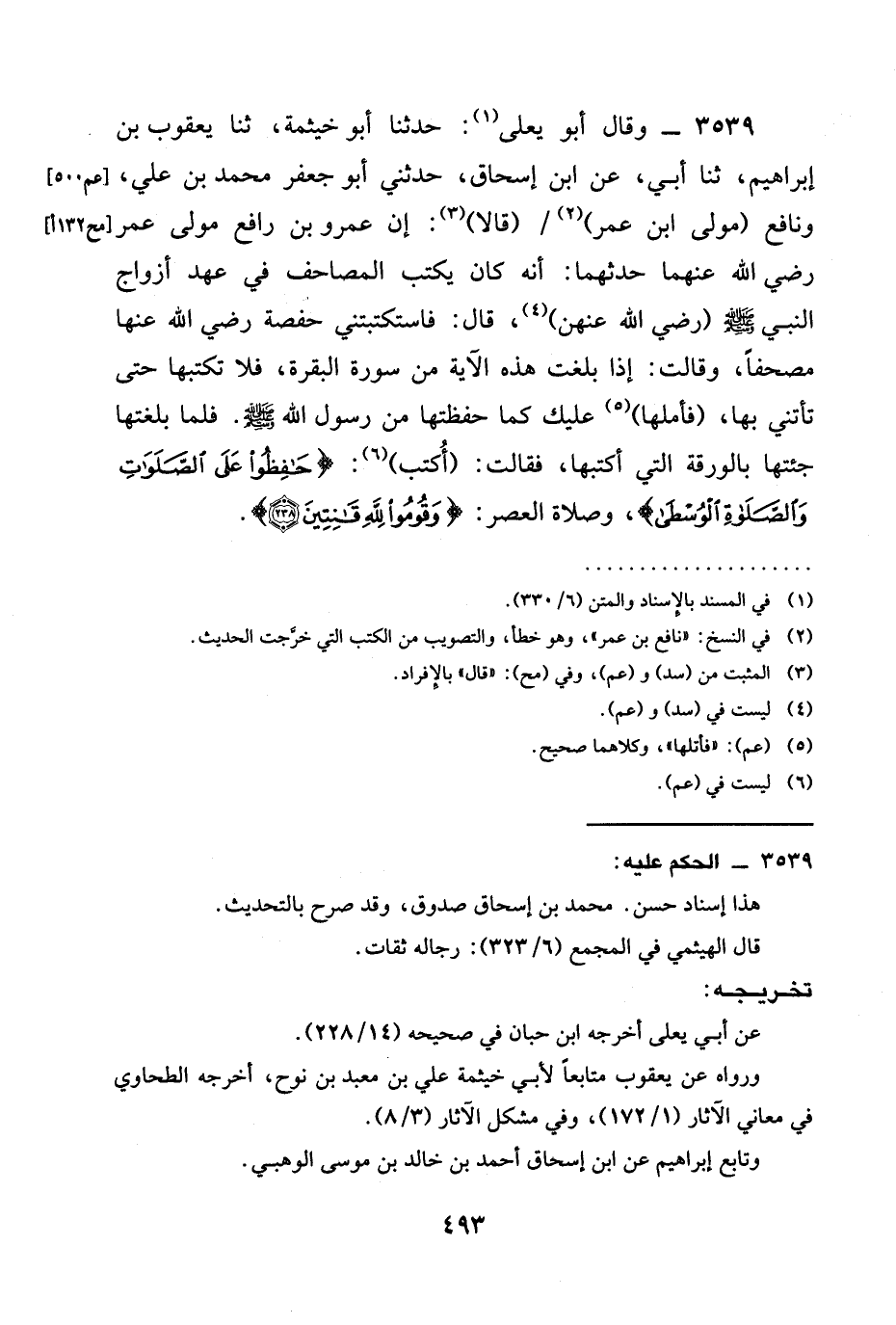 3539 - وَقَالَ أَبُو يَعْلَى: حدثنا أَبُو خَيْثَمَةَ، ثنا يَعْقُوبُ بْنُ إِبْرَاهِيمَ، ثنا أَبِي، عَنِ ابْنِ إِسْحَاقَ، حَدَّثَنِي أَبُو جَعْفَرٍ مُحَمَّدُ بْنُ عَلِيٍّ، وَنَافِعُ (مَوْلَى ابن عمر) / (قالا) : إِنَّ عَمْرَو بْنَ رَافِعٍ مولى عمر رَضِيَ الله عَنْهما حَدَّثَهُمَا: أَنَّهُ كَانَ يَكْتُبُ الْمَصَاحِفَ فِي عَهْدِ أَزْوَاجِ النَّبِيِّ صَلَّى اللَّهُ عَلَيْهِ وَسَلَّمَ (رَضِيَ الله عَنْهن) ، قَالَ: فَاسْتَكْتَبَتْنِي حَفْصَةُ رَضِيَ الله عَنْها مُصْحَفًا، وَقَالَتْ: إِذَا بَلَغَتْ هَذِهِ الْآيَةَ مِنْ سُورَةِ الْبَقَرَةِ، فَلَا تَكْتُبْهَا حَتَّى تأتني بِهَا، (فأملها) عَلَيْكَ كَمَا حَفِظْتُهَا مِنْ رَسُولِ اللَّهِ صَلَّى اللَّهُ عَلَيْهِ وَسَلَّمَ. فَلَمَّا بَلَغْتُهَا جِئْتَهَا بِالْوَرَقَةِ الَّتِي أَكْتُبُهَا، فَقَالَتِ: (اكْتُبْ) : {§حَافِظُوا عَلَى الصَّلَوَاتِ وَالصَّلَاةِ الْوُسْطَى} ، وصلاة الْعَصْرِ: {وَقُومُوا لِلَّهِ قَانِتِينَ -[500]- (238) } .