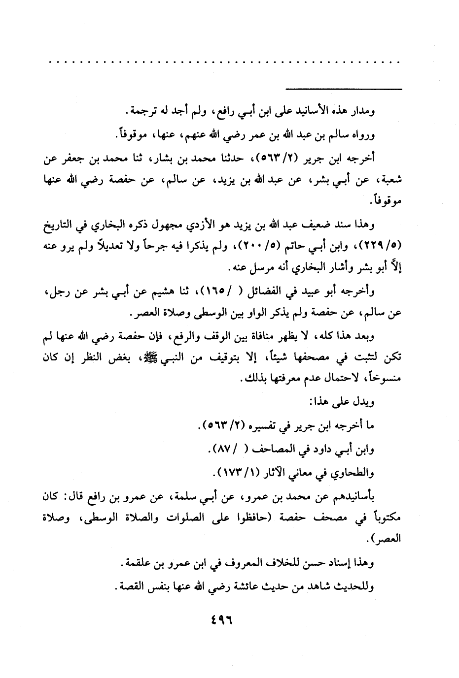 بأسانيدهم عَنْ مُحَمَّدِ بْنِ عَمْرٍو، عَنْ أَبِي سَلَمَةَ، عن عمرو بن رافع قال: كان مكتوبًا في مصحف حفصة (حافظوا على الصلوات والصلاة الوسطى، وصلاة العصر).