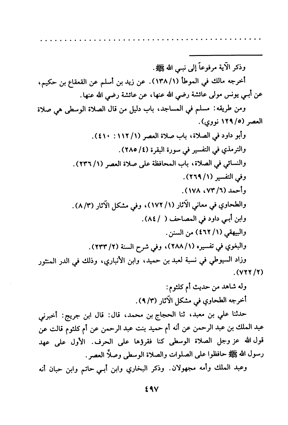 حدّثنا علي بن معبد، ثنا الحجاج بن محمد، قال: قال ابن جريج: أخبرني عبد الملك بن عبد الرحمن عن أنه أم حميد بنت عبد الرحمن عن أم كلثوم قالت عن قول الله عَزَّ وَجَلَّ الصلاة الوسطى كنا نقرؤها على الحرف الأول عَلَى عَهْدِ رَسُولِ اللَّهِ -صَلَّى اللَّهُ عَلَيْهِ وسلم- حافظوا على الصلوات والصلاة الوسطى وصلاة العصر.