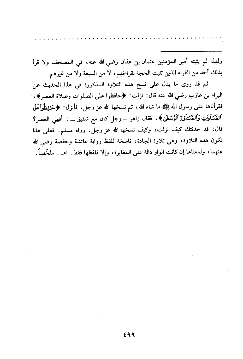 ثم قد روى ما يدل على نسخ هذه التلاوة المذكورة في هذا الحديث عَنِ الْبَرَاءِ بْنِ عَازِبٍ رَضِيَ اللَّهُ عَنْهُ قال: نزلت: (حافظوا على الصلوات وصلاة العصر)، فقرأناها على رسول الله -صلى الله عليه وسلم- ما شاء الله، ثم نسخها الله عزَّ وجلّ، فأنزل: {حَافِظُوا عَلَى الصَّلَوَاتِ وَالصَّلَاةِ الْوُسْطَى}، فقال زاهر -رجل كان مع شقيق-: أفهي العصر؟ قال: قد حدثتك كيف نزلت، وكيف نسخها الله عزَّ وجلّ. رواه مسلم. فعلى هذا تكون هذه التلاوة، وهي تلاوة الجادة، ناسخة للفظ رواية عائشة وحفصة رضي الله عنهما، ولمعناها إن كانت الواو دالة على المغايرة، وإلا فلفظها فقط. اهـ. ملخصًا.