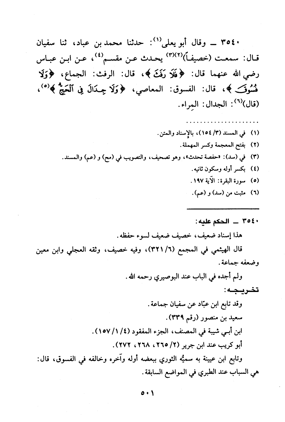 3540 - وَقَالَ أَبُو يَعْلَى: حدثنا مُحَمَّدُ بْنُ عَبَّادٍ، ثنا سُفْيَانُ قَالَ: سَمِعْتُ (خُصَيْفًا) يُحَدِّثُ عَنْ مِقْسَمٍ، عَنِ ابْنِ عَبَّاسٍ رَضِيَ الله عَنْهما قَالَ: {§فَلَا رَفَثَ} ، قَالَ: الرَّفَثُ: الْجِمَاعُ، {وَلَا فُسُوقَ} ، قَالَ: الْفُسُوقُ: الْمَعَاصِي، {وَلَا جِدَالَ فِي الْحَجِّ} ، (قال) : الْجِدَالُ: الْمِرَاءُ.
