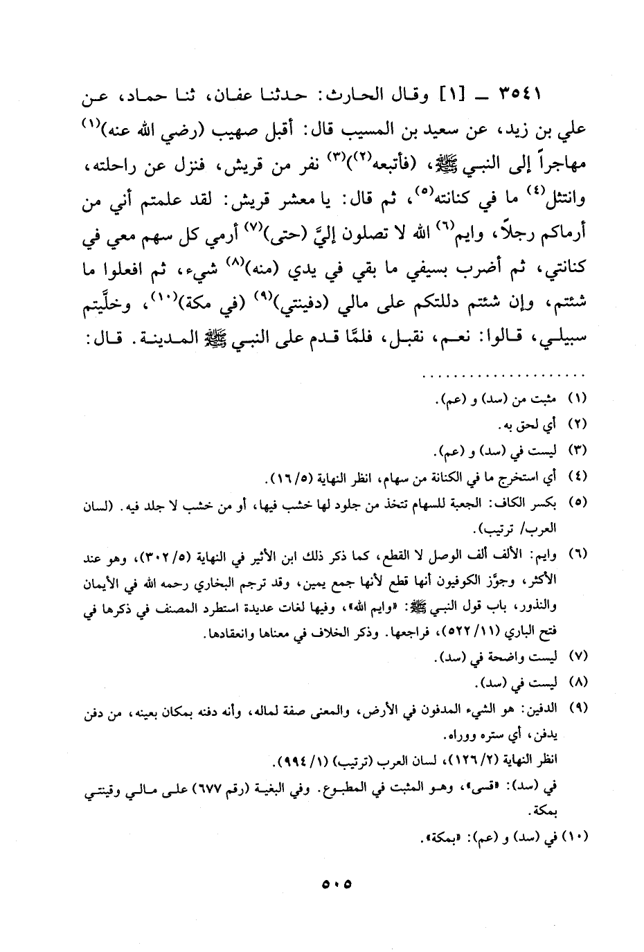 3541 -[1] وَقَالَ الْحَارِثُ: حدثنا عَفَّانُ، ثنا حَمَّادٌ، عَنْ عَلِيِّ بْنِ زَيْدٍ، عَنْ سَعِيدِ بْنِ الْمُسَيِّبِ قَالَ: أَقْبَلَ صُهَيْبٌ (رَضِيَ الله عَنْه) مُهَاجِرًا إِلَى النَّبِيِّ صَلَّى اللَّهُ عَلَيْهِ وَسَلَّمَ، (فَأَتْبَعَهُ) نَفَرٌ مِنْ قُرَيْشٍ، فَنَزَلَ عَنْ رَاحِلَتِهِ، وَانْتَثَلَ مَا فِي كِنَانَتِهِ، ثُمَّ قَالَ: يَا مَعْشَرَ قُرَيْشٍ: لَقَدْ عَلِمْتُمْ أَنِّي مِنْ أَرْمَاكُمْ رَجُلًا، وَايْمُ اللَّهِ لَا تَصَلِونَ إِلَيَّ (حَتَّى) أَرْمِيَ كُلَّ سَهْمٍ مَعِي فِي كِنَانَتِي، ثُمَّ أَضْرِبَ بِسَيْفِي مَا بَقِيَ فِي يَدِي (مِنْهُ) شَيْءٌ، ثُمَّ افْعَلُوا ما شئتم، وَإِنْ شِئْتُمْ دَلَلْتُكُمْ عَلَى مَالِي (دفينتي) (في مكة) ، وَخَلَّيْتُمْ سَبِيلِي، قَالُوا: نَعَمْ، نقبل، فَلَمَّا قَدِمَ عَلَى النَّبِيِّ صَلَّى اللَّهُ عَلَيْهِ وَسَلَّمَ الْمَدِينَةَ. قَالَ: