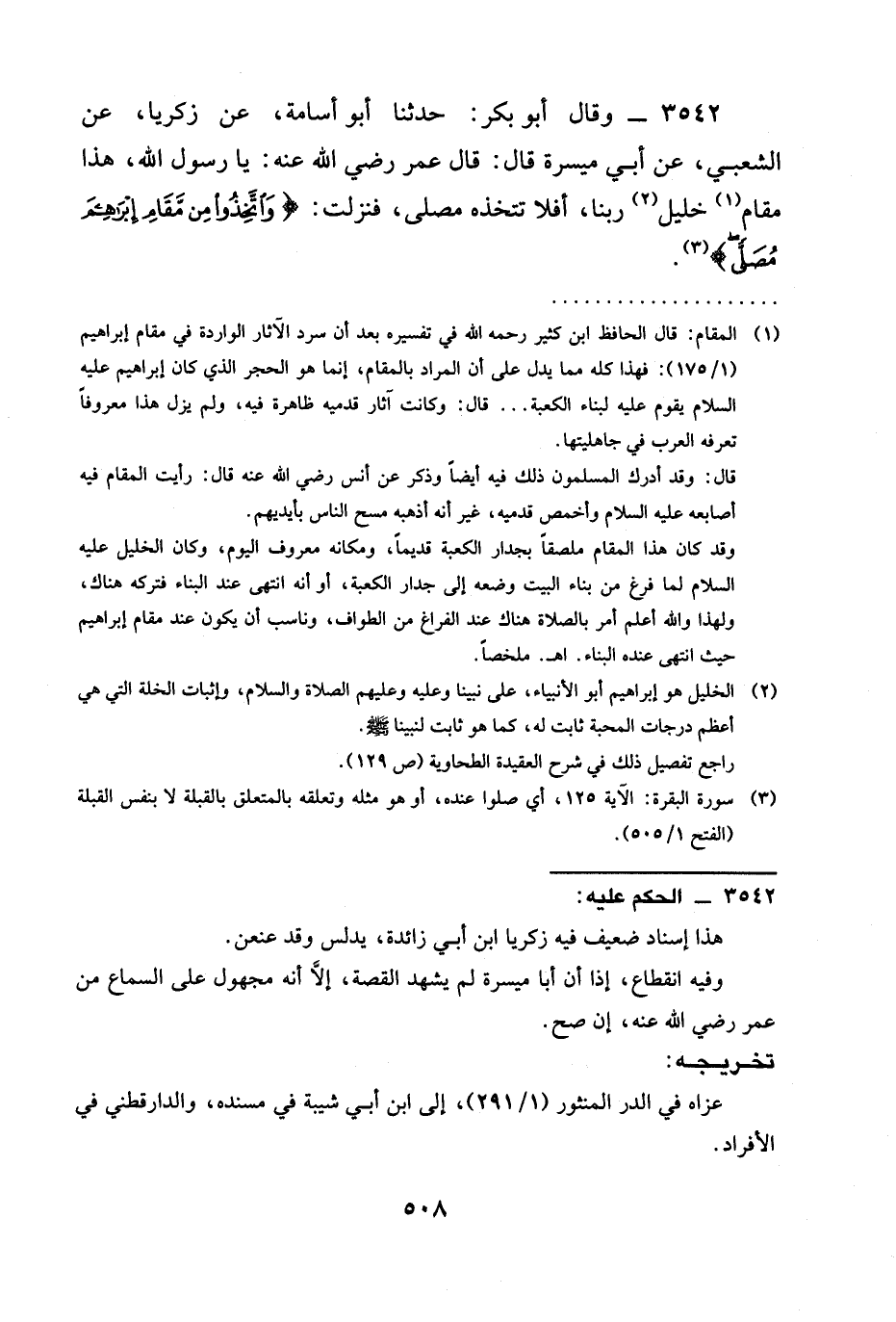 3542 - وَقَالَ أَبُو بَكْرٍ: حدثنا أَبُو أُسَامَةَ، عَنْ زَكَرِيَّا، عَنِ الشَّعْبِيِّ، عَنْ أَبِي مَيْسَرَةَ قَالَ: قَالَ عُمَرُ رَضِيَ الله عَنْه: يَا رَسُولَ اللَّهِ، §هَذَا مَقَامُ خَلِيلِ رَبِّنَا، أَفَلَا تتخذه مُصَلًّى، فَنَزَلَتْ: {وَاتَّخِذُوا مِنْ مَقَامِ إِبْرَاهِيمَ مُصَلًّى} .
