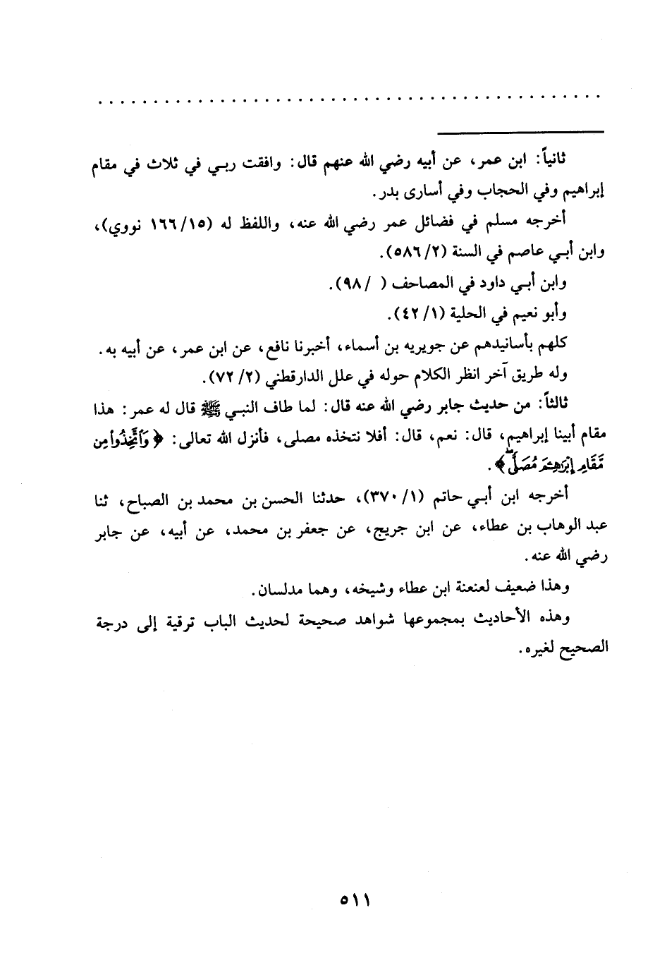 = ثانيًا: ابن عُمَرَ، عَنْ أَبِيهِ رَضِيَ اللَّهُ عَنْهُمْ قَالَ: وافقت ربي في ثلاث في مقام إبراهيم وفي الحجاب وفي أسارى بدر.