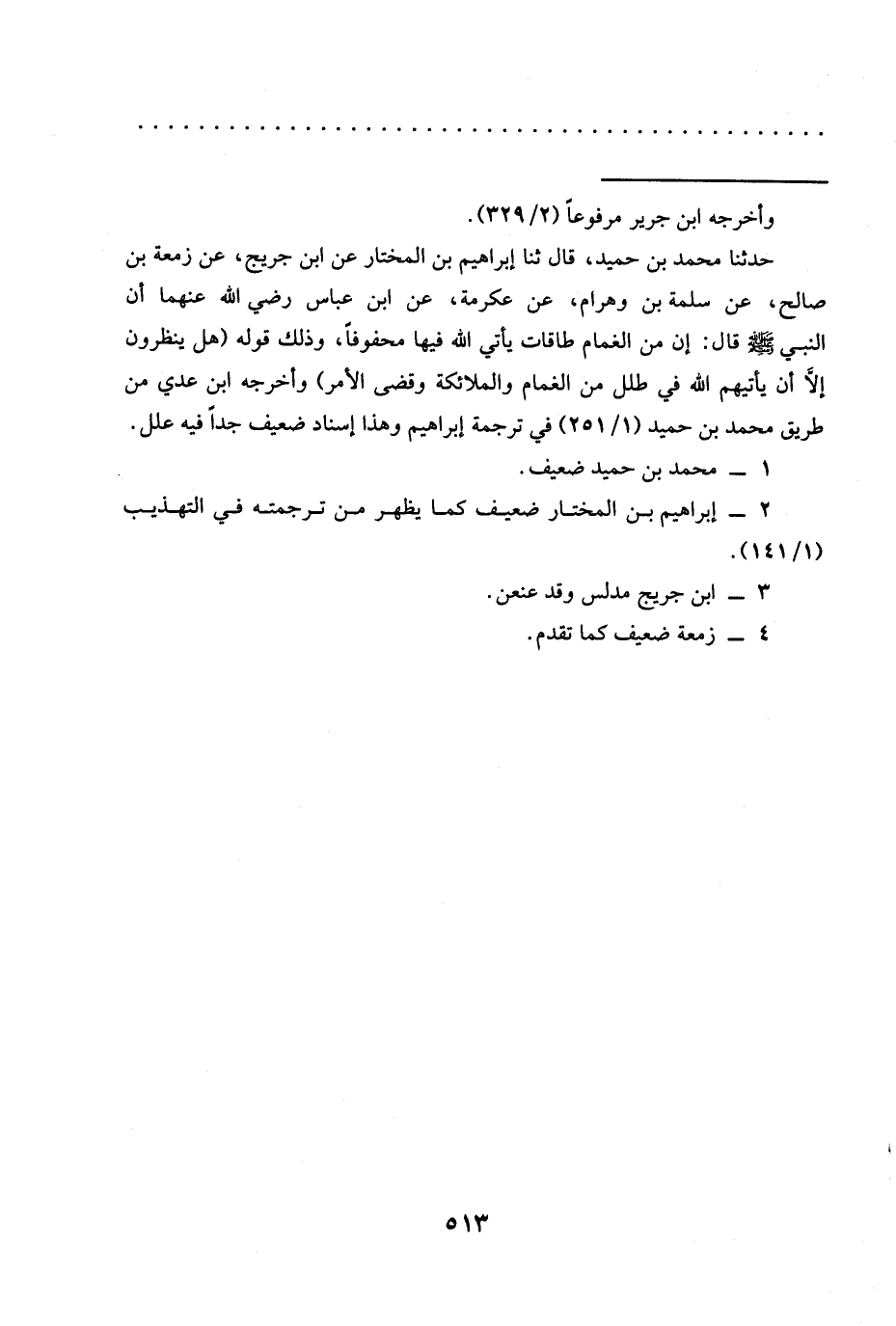 حدّثنا محمد بن حميد، قال ثنا إبراهيم بن المختار عن ابن جريج، عن زَمْعَةُ بْنُ صَالِحٍ، عَنْ سَلَمَةَ بْنِ وَهْرَامَ، عن عكرمة، عن ابن عباس رضي الله عَنْهُمَا أَنَّ النَّبِيَّ -صَلَّى اللَّهُ عَلَيْهِ وَسَلَّمَ- قال: إن من الغمام طاقات يأتي الله فيها محفوفًا، وذلك قوله {هَلْ يَنْظُرُونَ إِلَّا أَنْ يَأْتِيَهُمُ اللَّهُ فِي ظُلَلٍ مِنَ الْغَمَامِ وَالْمَلَائِكَةُ} وأخرجه ابن عدي من طريق محمد بن حميد (1/ 251) في ترجمة إبراهيم وهذا إسناد ضعيف جدًا فيه علل.