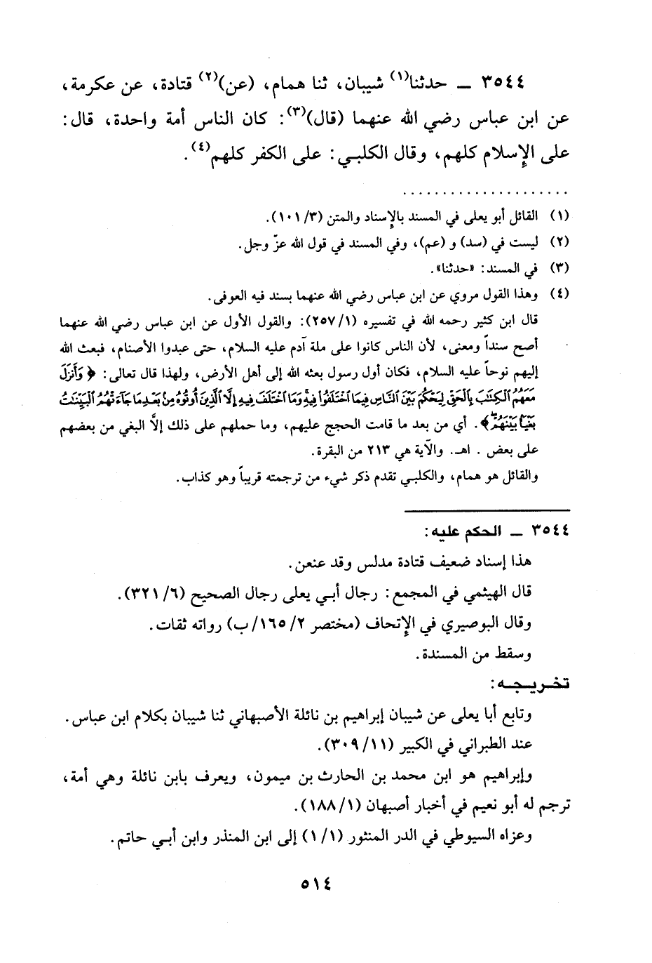 3544 - حدّثنا (¬1) شَيْبَانُ، ثنا هَمَّامٌ، (عَنْ) (¬2) قَتَادَةَ، عَنْ عِكْرِمَةَ، عَنِ ابْنِ عَبَّاسٍ رَضِيَ اللَّهُ عَنْهُمَا (قَالَ) (¬3): كان الناس أمة واحدة، قَالَ: عَلَى الإِسلام كُلُّهُمْ، وَقَالَ الْكَلْبِيُّ: عَلَى الكفر كلهم (¬4).