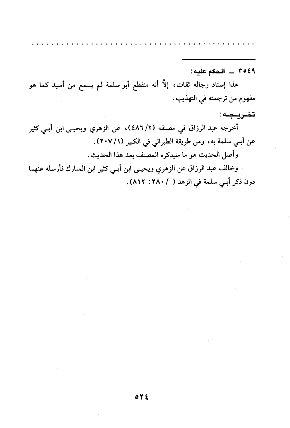 وخالف عبد الرزاق عن الزهري ويحيى ابن أبي كثير ابن المبارك فأرسله عنهما دون ذكر أبي سلمة في الزهد (/280: 812).