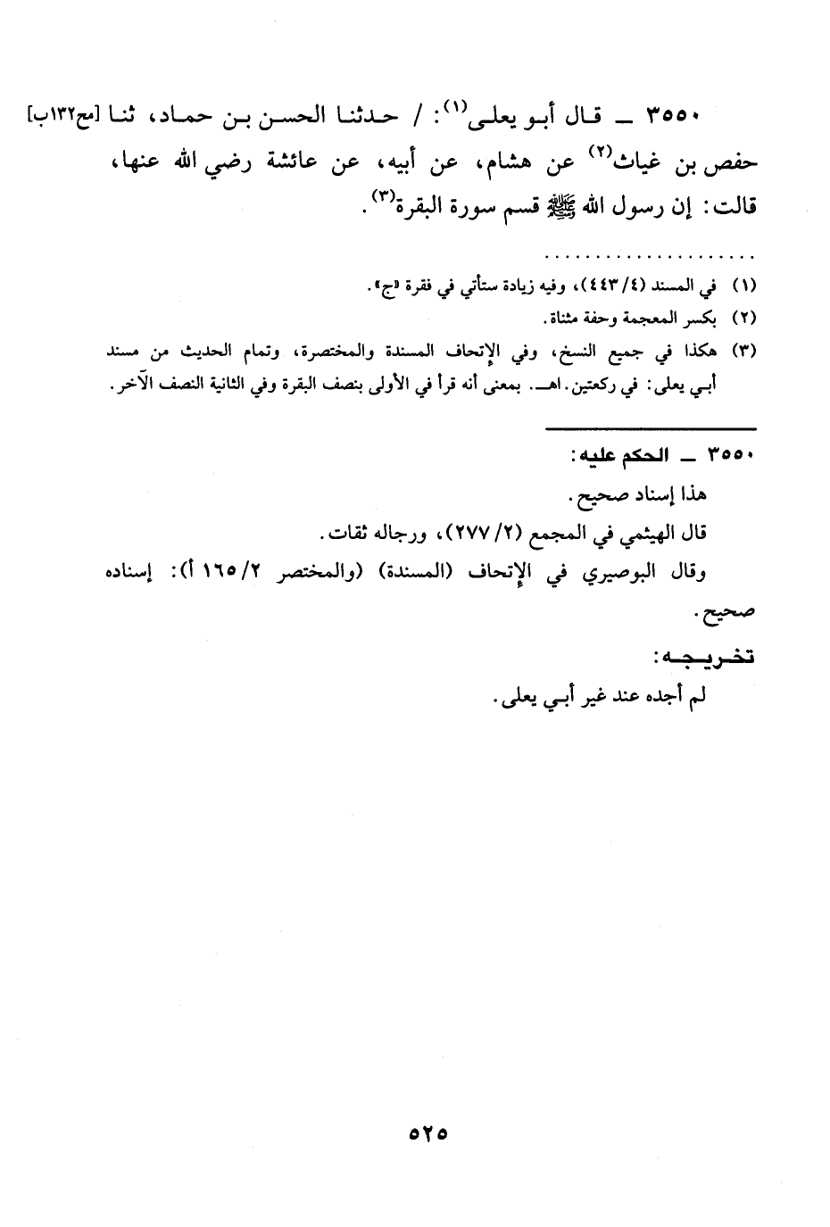 3550 - قَالَ أَبُو يَعْلَى: / حدثنا الْحَسَنُ بْنُ حَمَّادٍ، ثنا حَفْصُ بْنُ غِيَاثٍ عَنْ هِشَامٍ، عَنْ أَبِيهِ، عَنْ عَائِشَةَ رَضِيَ الله عَنْها، قالت: إِنَّ رَسُولَ اللَّهِ صَلَّى اللَّهُ عَلَيْهِ وَسَلَّمَ §قَسَمَ سُورَةُ الْبَقَرَةِ.