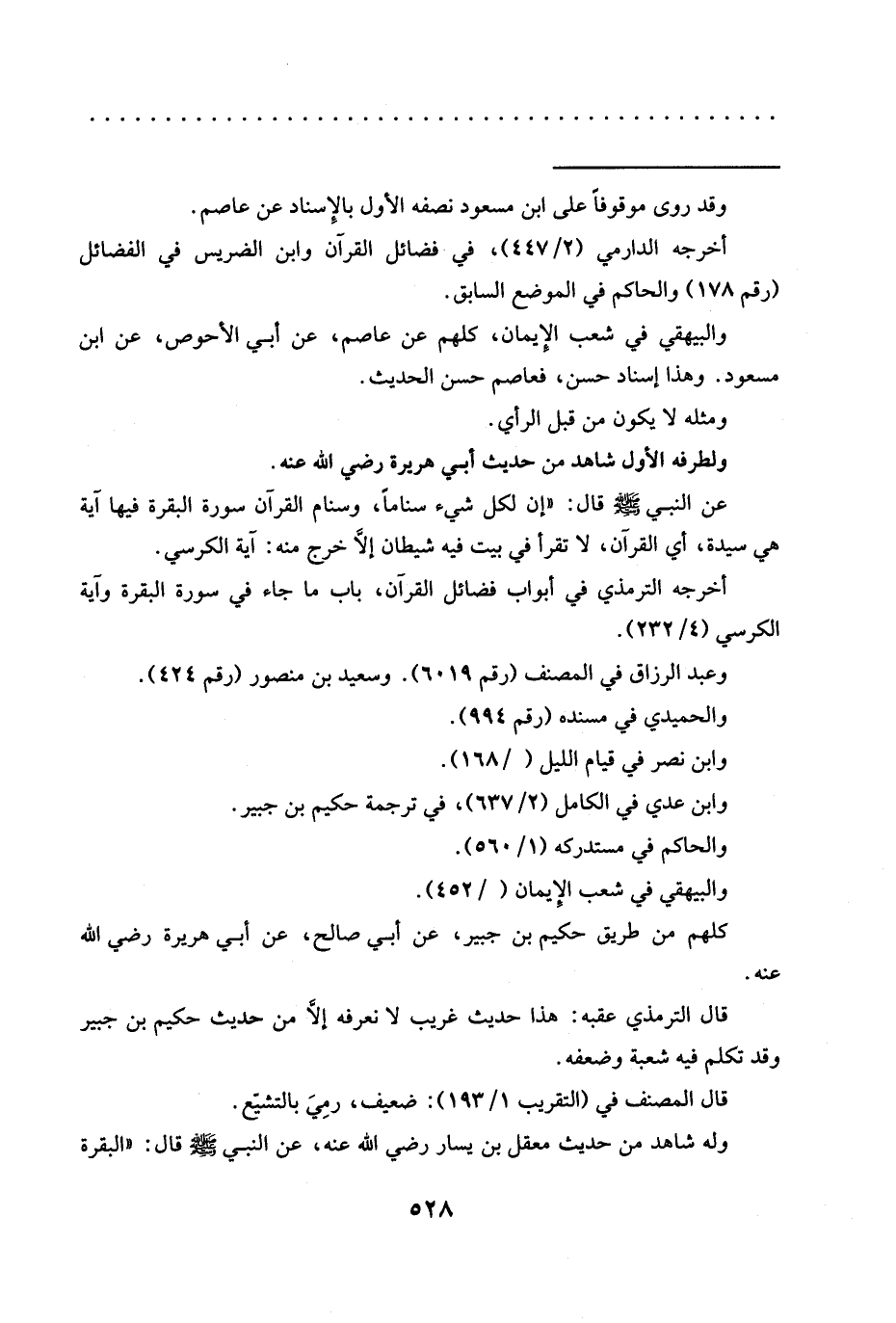 والبيهقي في شعب الإيمان، كلهم عن عاصم، عن أبي الأحوص، عن ابن مسعود. وهذا إسناد حسن، فعاصم حسن الحديث.