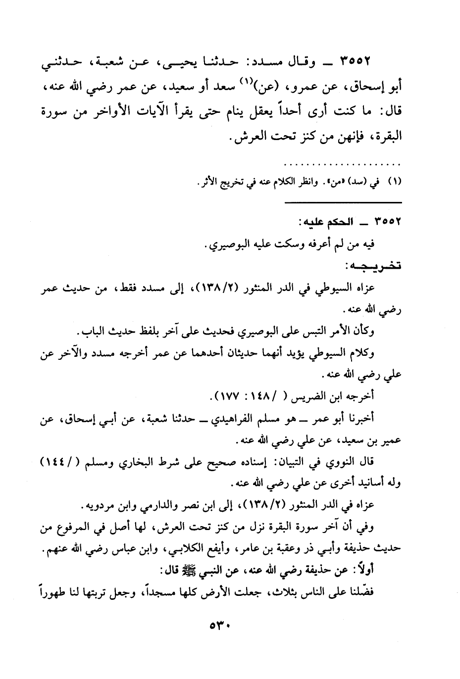 3552 - وَقَالَ مُسَدَّدٌ: حدثنا يَحْيَى، عَنْ شُعْبَةَ، حَدَّثَنِي أَبُو إِسْحَاقَ، عَنْ عمرو (عَنْ) سَعْدٍ أَوْ سَعِيدٍ، عَنْ عُمَرَ رَضِيَ الله عَنْه، قَالَ: §مَا كُنْتُ أَرَى أَحَدًا يَعْقِلُ يَنَامُ حَتَّى يَقْرَأَ الْآيَاتِ الْأَوَاخِرِ مِنْ سُورَةِ الْبَقَرَةِ، فَإِنَّهُنَّ مِنْ كَنْزٍ تَحْتَ الْعَرْشِ.