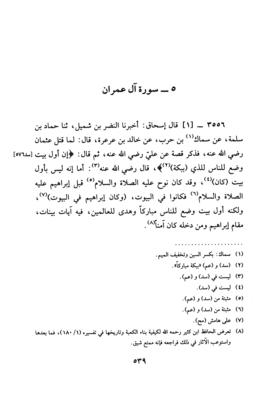 3556 -[1] قَالَ إِسْحَاقُ: أخبرنا النَّضْرُ بْنُ شُمَيْلٍ، ثنا حَمَّادُ بْنُ سَلَمَةَ، عَنْ سِمَاكِ بْنِ حَرْبٍ، عَنْ خَالِدِ بْنِ عَرْعَرَةَ، قَالَ: لَمَّا قُتِلَ عُثْمَانُ رَضِيَ الله عَنْه، فَذَكَرَ قِصَّةً عَنْ عَلِيٍّ رَضِيَ الله عَنْه، ثُمَّ قَالَ: {§إِنَّ أَوَّلَ بَيْتٍ وُضِعَ لِلنَّاسِ لِلَّذِي بِبَكَّةَ} ، قَالَ رَضِيَ الله عَنْه: أَمَا إِنَّهُ لَيْسَ بِأَوَّلِ بَيْتٍ (كَانَ) ، وقد كَانَ نُوحُ عليه الصلاة والسلام قبل إبراهيم عليه الصلاة والسلام فَكَانُوا فِي الْبُيُوتِ، (وَكَانَ إِبْرَاهِيمُ فِي البيوت) ، وَلَكِنَّهُ أَوَّلُ بَيْتٍ وُضِعَ لِلنَّاسِ مُبَارَكًا وَهُدًى لِلْعَالَمِينَ، فِيهِ آيَاتٌ بَيِّنَاتٌ، مَقَامُ إِبْرَاهِيمَ وَمَنْ دَخَلَهُ كَانَ آمِنًا -[540]-.