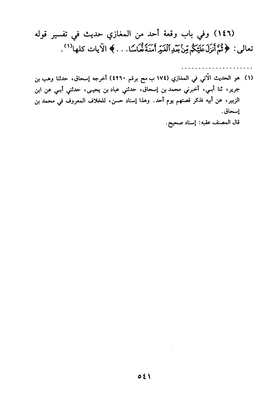 (146) وَفِي بَابِ وَقْعَةِ أُحُدٍ مِنَ الْمَغَازِي حَدِيثٌ فِي تَفْسِيرِ قَوْلِهِ تَعَالَى: {ثُمَّ أَنْزَلَ عَلَيْكُمْ مِنْ بَعْدِ الْغَمِّ أَمَنَةً نُعَاسًا ...} الآيات كلها (¬1).