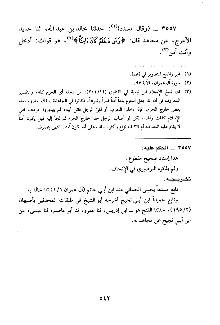 3557 - (وَقَالَ مُسَدَّدٌ) : حدثنا خَالِدُ بْنُ عَبْدِ اللَّهِ، ثنا حُمَيْدٌ الْأَعْرَجُ، عَنْ مُجَاهِدٍ قَالَ: {§وَمَنْ دَخَلَهُ كَانَ آمِنًا} ، هُوَ قولك: ادْخُلْ وَأَنْتَ آمِنٌ.