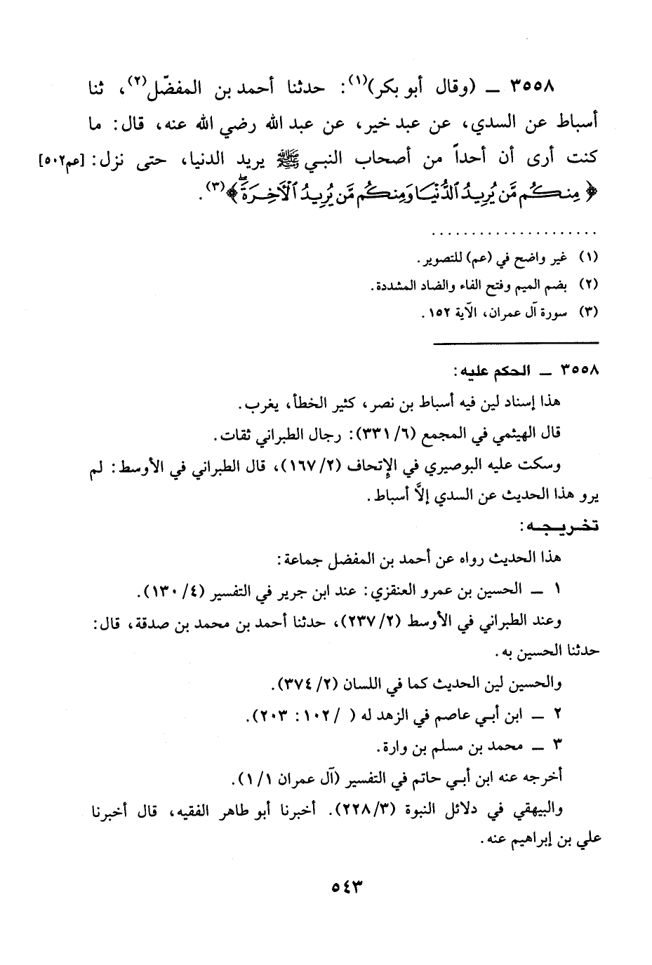 3558 - (وَقَالَ أَبُو بَكْرِ) : حدثنا أَحْمَدُ بْنُ الْمُفَضَّلِ، ثنا أَسْبَاطٌ عَنِ السُّدِّيِّ، عَنْ عَبْدِ خَيْرٍ، عَنْ عَبْدِ اللَّهِ رَضِيَ الله عَنْه، قَالَ: §مَا كُنْتُ أَرَى أَنَّ أَحَدًا مِنْ أَصْحَابِ النَّبِيِّ صَلَّى اللَّهُ عَلَيْهِ وَسَلَّمَ يُرِيدُ الدُّنْيَا، حَتَّى نَزَلَ: {مِنْكُمْ مَنْ يُرِيدُ الدُّنْيَا وَمِنْكُمْ مَنْ يُرِيدُ الْآخِرَةَ} .
