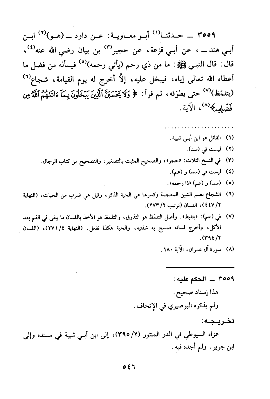 3559 - حدثنا أَبُو مُعَاوِيَةَ: عَنْ دَاوُدَ - (هو) ابن أَبِي هِنْدٍ -، عَنْ أَبِي قَزَعَةَ، عَنْ حُجَيْرِ بْنِ بَيَانَ رَضِيَ الله عَنْه، قَالَ: قَالَ النَّبِيُّ صَلَّى اللَّهُ عَلَيْهِ وَسَلَّمَ: §مَا مِنْ ذِي رَحِمٍ (يَأْتِي رَحِمَهُ) فَيَسْأَلُهُ مِنْ فَضْلِ مَا أَعْطَاهُ اللَّهُ تَعَالَى إِيَّاهُ، فَيَبْخَلُ عَلَيْهِ، إِلَّا أُخْرِجَ لَهُ يَوْمَ الْقِيَامَةِ، شُجَاعٌ (يَتَلَمَّظُ) حَتَّى يُطَوِّقَهُ، ثُمَّ قَرَأَ: {وَلَا يَحْسَبَنَّ الَّذِينَ يَبْخَلُونَ بِمَا آتَاهُمُ اللَّهُ مِنْ فَضْلِهِ} ، الْآيَةَ.