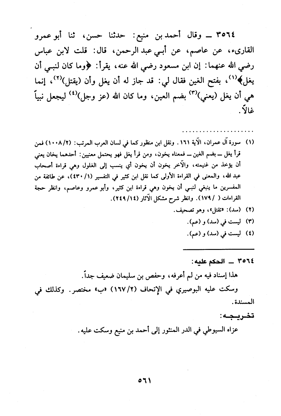 3564 - وَقَالَ أَحْمَدُ بْنُ مَنِيعٍ: حدثنا حَسَنٌ، ثنا أَبُو عَمْرٍو الْقَارِئُ، عَنْ عَاصِمٍ، عَنْ أَبِي عَبْدِ الرَّحْمَنِ، قَالَ: قُلْتُ لِابْنِ عَبَّاسٍ رَضِيَ الله عَنْهما: إِنَّ §ابْنَ مَسْعُودٍ رَضِيَ الله عَنْه، يَقْرَأُ: {وَمَا كَانَ لِنَبِيٍّ أَنْ يُغَلَّ} ، بِفَتْحِ الْغَيْنِ فَقَالَ لي: قَدْ جَازَ لَهُ أَنْ يُغَلَّ وَأَنْ (يُقْتَلَ) ، إِنَّمَا هِيَ أَنْ يَغُلَّ (يَعْنِي) بِضَمِّ العين، وما كَانَ اللَّهُ (عَزَّ وَجَلَّ) لِيَجْعَلَ نَبِيًّا غَالًّا.