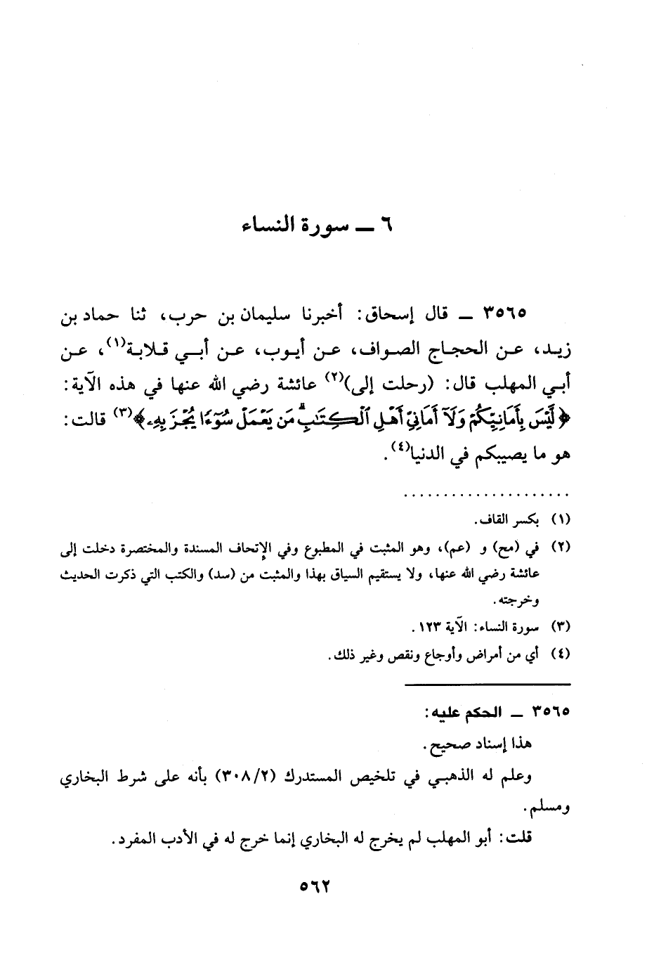 3565 - قَالَ إِسْحَاقُ: أخبرنا سُلَيْمَانُ بْنُ حَرْبٍ، ثنا حَمَّادُ بْنُ زَيْدٍ، عَنِ الْحَجَّاجِ الصَّوَّافِ، عَنْ أَيُّوبَ، عَنْ أَبِي قِلَابَةَ، عَنْ أَبِي الْمُهَلَّبِ قَالَ:: (رَحَلْتُ إِلَى) عَائِشَةَ رَضِيَ الله عَنْها فِي هَذِهِ الْآيَةِ: {§لَيْسَ بِأَمَانِيِّكُمْ وَلَا أَمَانِيِّ أَهْلِ الْكِتَابِ مَنْ يَعْمَلْ سُوءًا يُجْزَ بِهِ} قَالَتْ: هُوَ مَا يُصِيبُكُمْ فِي الدُّنْيَا.