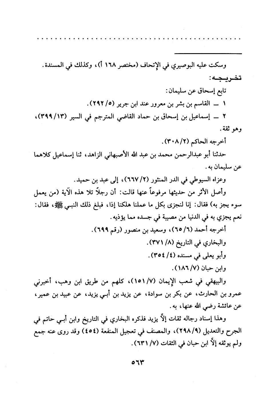 وأصل الأثر من حديثها مرفوعًا عنها قالت: أن رجلًا تلا هذه الآية (من يعمل سوء يجز به) فقال: إنا لنجزى بكل ما عملنا هلكنا إذا، فَبَلَغَ ذَلِكَ النَّبِيَّ -صَلَّى اللَّهُ عَلَيْهِ وَسَلَّمَ-، فقال: نعم يجزي به في الدنيا من مصيبة في جسده مما يؤذيه.