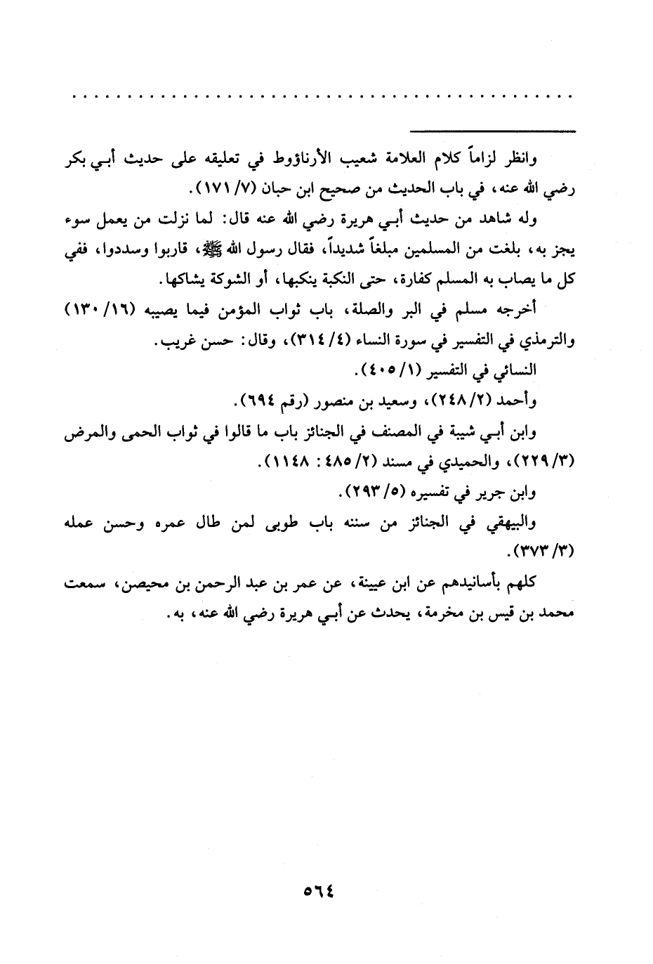 وله شاهد مِنْ حَدِيثِ أَبِي هُرَيْرَةَ رَضِيَ اللَّهُ عَنْهُ قال: لما نزلت من يعمل سوء يجز به، بلغت من المسلمين مبلغًا شديدًا، فَقَالَ رَسُولُ اللَّهِ -صَلَّى اللَّهُ عَلَيْهِ وَسَلَّمَ-، قاربوا وسددوا، ففي كل ما يصاب به المسلم كفارة، حتى النكبة ينكبها، أو الشوكة يشاكها.